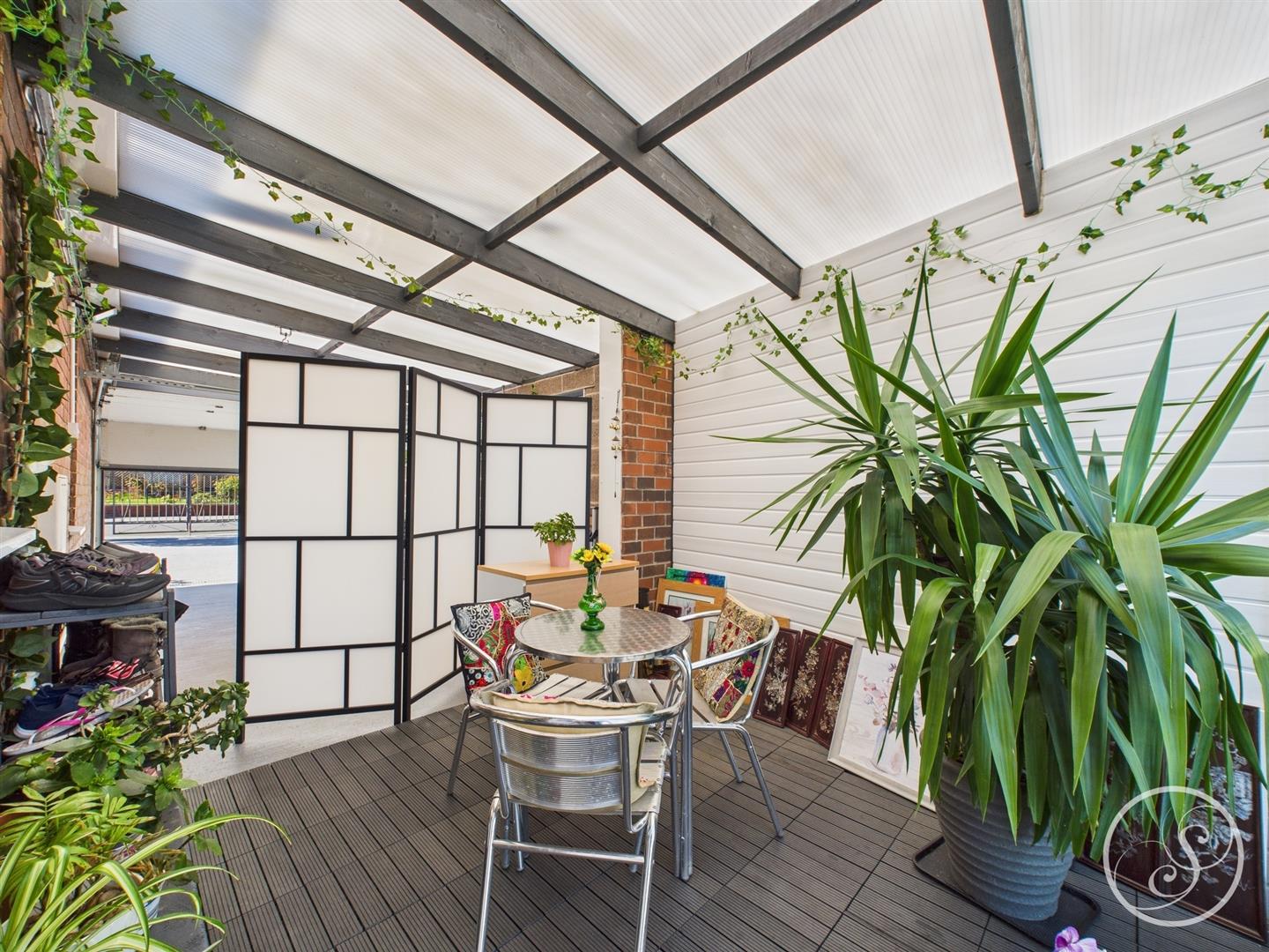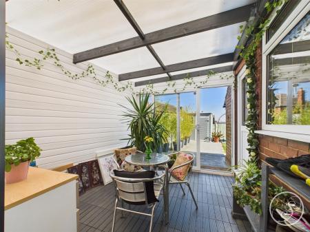 Sunroom/Garage - To the side of the property is a large driveway with manual up and over door and to the rear is a space currently used as a sunroom with sliding door leading out to the rear garden. The garage offers a great storage space.