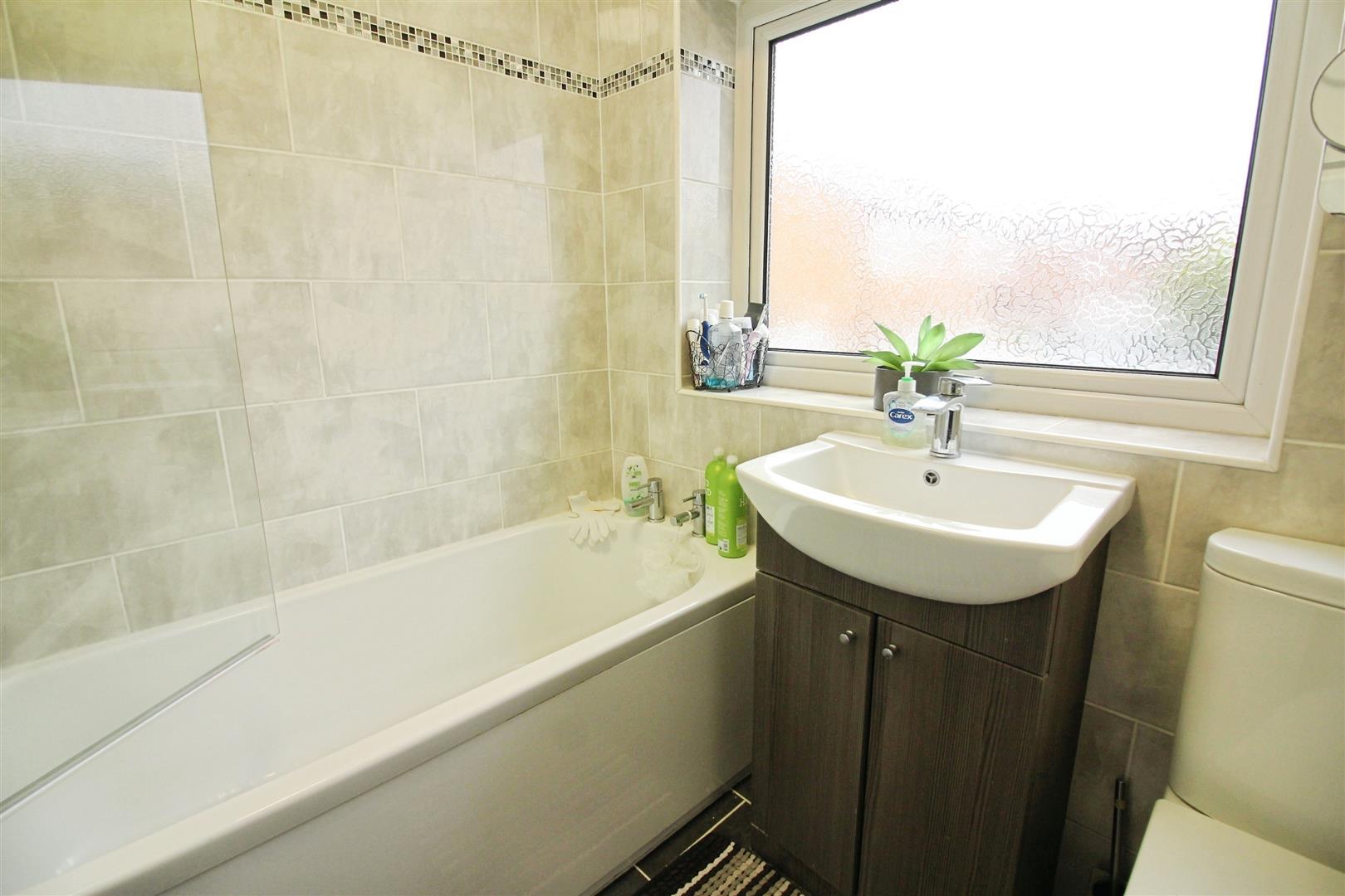 Bathroom - A modern fully tiled bathroom which comprises; a panelled bath serviced with a mains fed shower and glass screen, a hand wash basin with vanity storage and close coupled w.c. A ladder style central heating radiator and a double-glazed window to the rear.