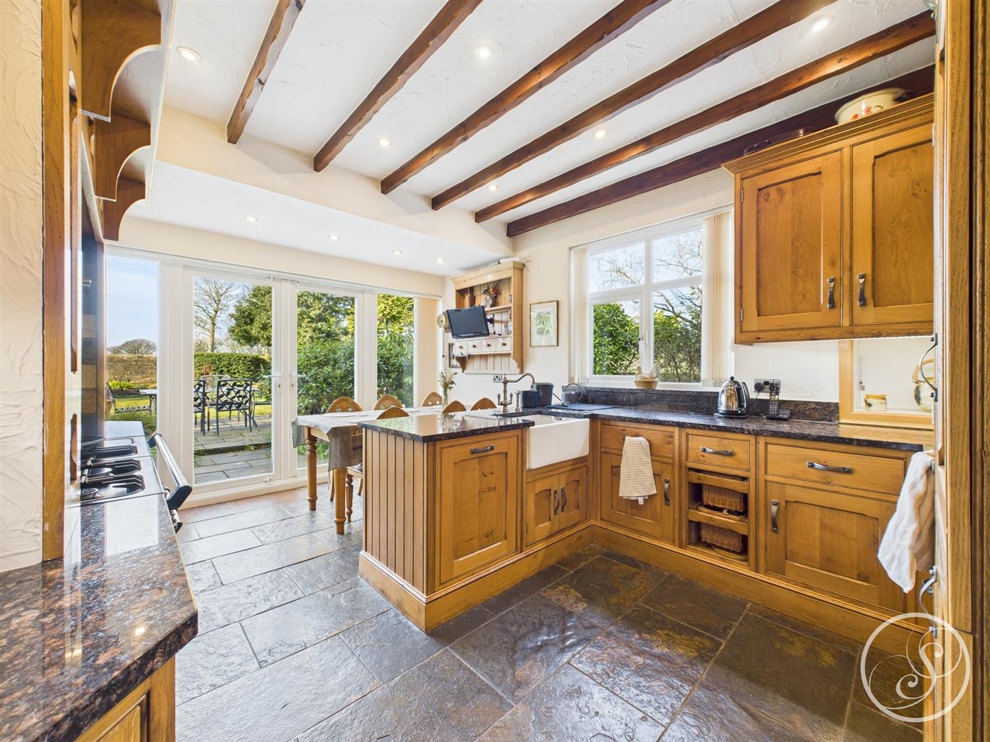 Kitchen - A true country style kitchen with dark wood cabinets, a range cooker, solid worktops and wooden beams to the ceiling. The kitchen is complete with integrated dishwasher and fridge/freezer, and offers space for an informal dining table, ideal for every day use. French doors lead out to the rear patio and garden and access is offered to the garage.