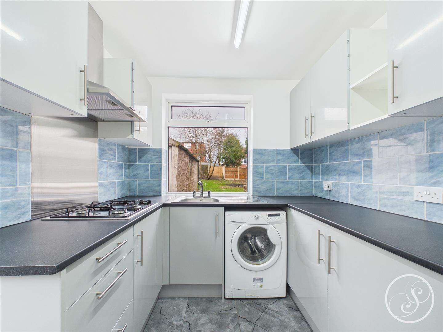 Kitchen - Well appointed kitchen made up of wall and base units, featuring gas hob with extractor fan, offering side access via the external door.