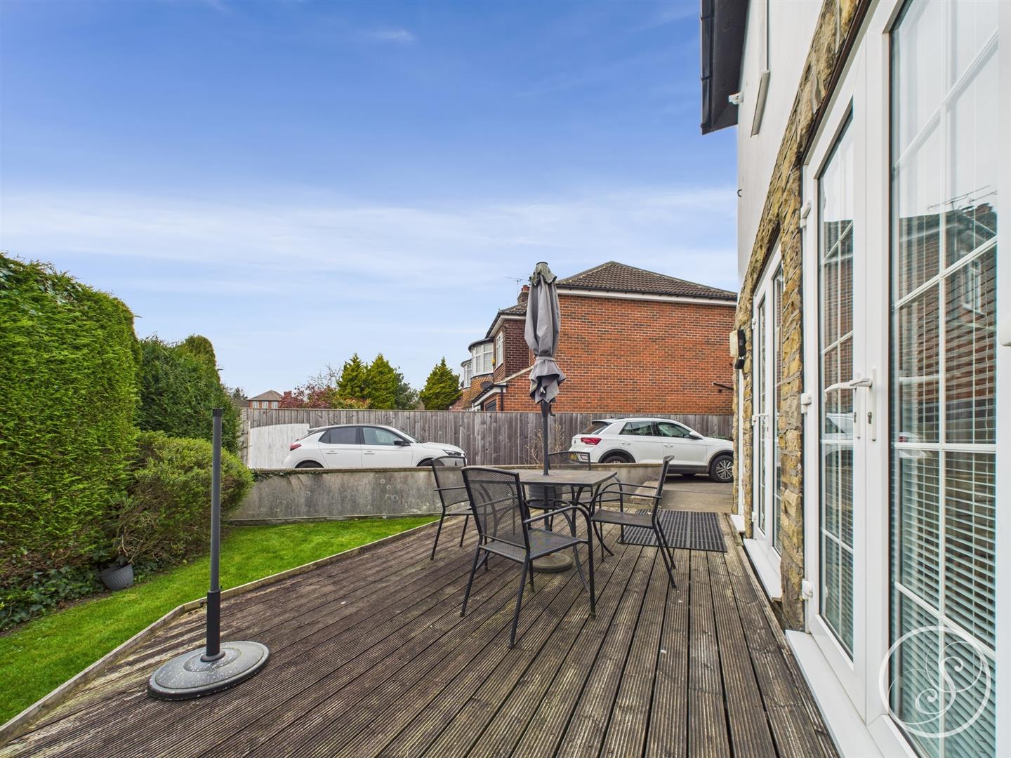 External - Situated on a large corner plot the property boasts gardens to three sides with a large lawned area to the front and side of the property with a raised decked area. To the rear is a spacious patio. Driveway accommodates 2-3 cars.