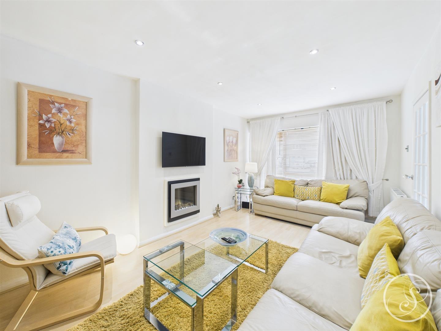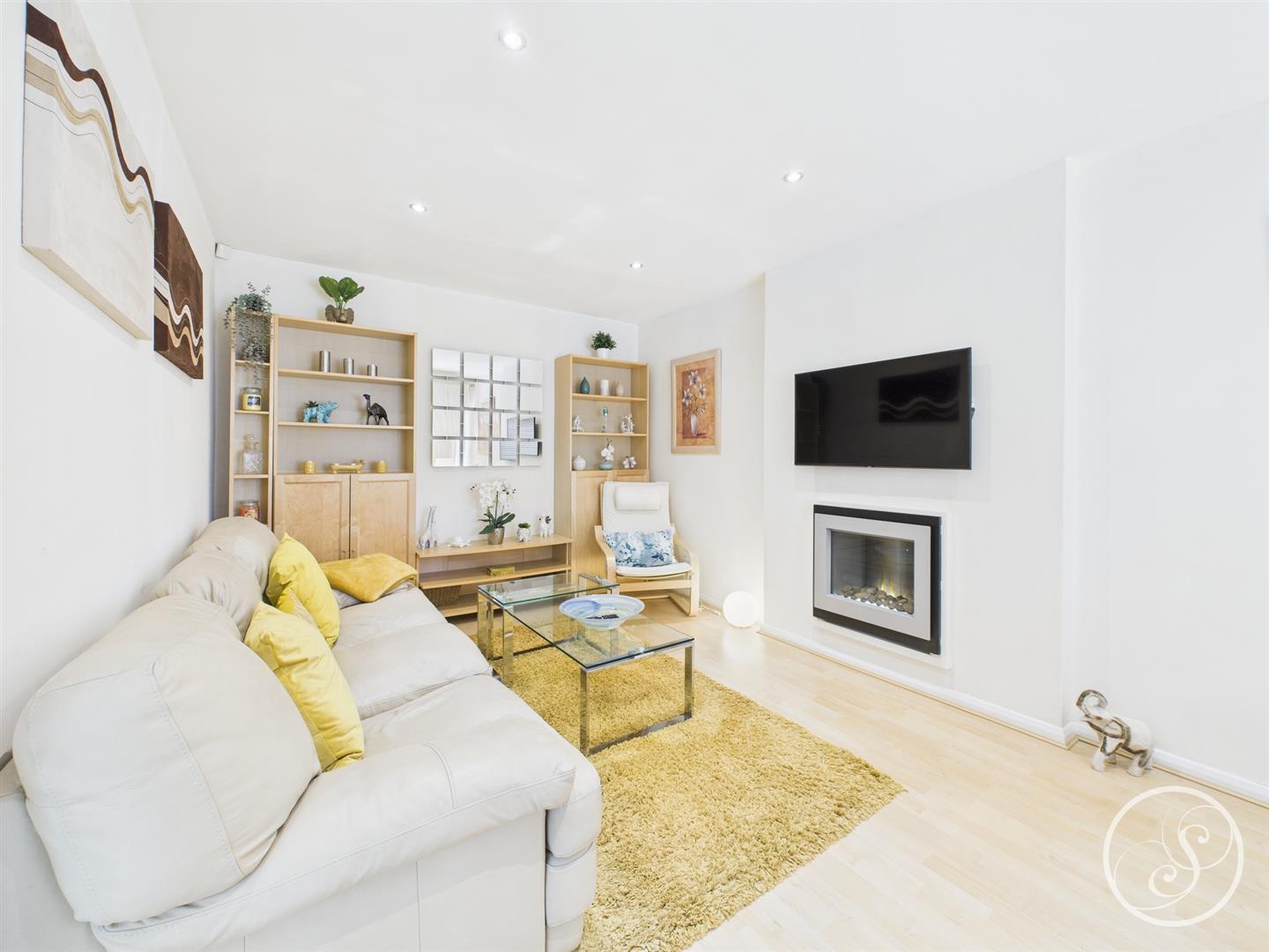 Living Room - The living room features laminate wood flooring, complemented by an electric fireplace that creates a cosy focal point. A large window allows plenty of natural light to flow in, while a central heating radiator ensures comfort throughout the year.