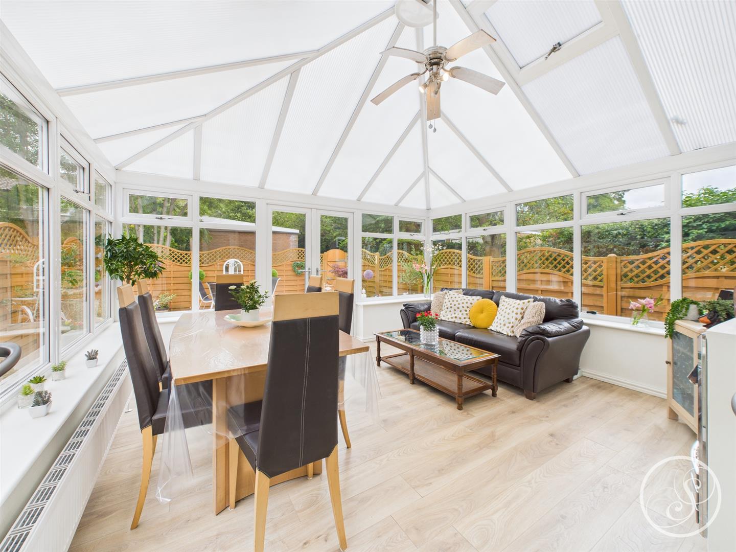 Conservatory - The excellent and modern conservatory offers a second spacious reception/dining room, complete with wood laminate flooring, windows all round, central heating radiator ceiling fan and electric radiator. French doors provide access back through to the kitchen and out to the patio area.