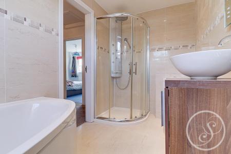 Bathroom - Tiled 4-piece house bathroom comprises, corner bath, shower, toilet, sink and towel radiator.