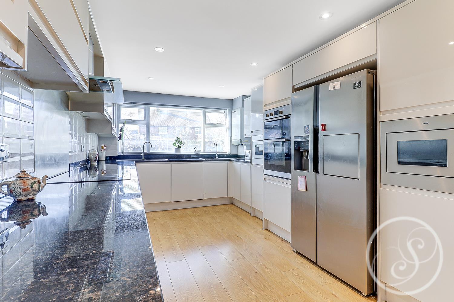Kitchen - Modern kitchen is made up of white gloss wall and base units and comprises integrated dishwasher, two integrated microwaves, integrated double oven, twin sinks with drainers, space for American style fridge/freezer and ample storage space, all finished with solid workstops. Separate breakfast bar for 4 with wooden worktop.