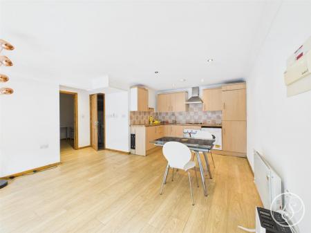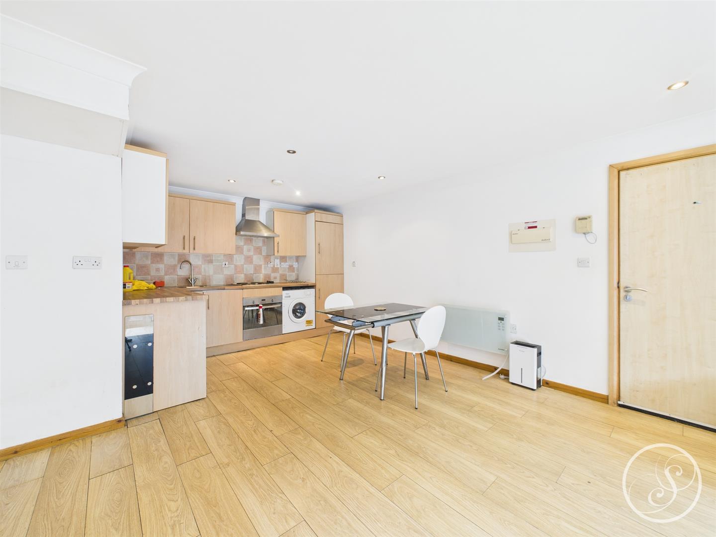 Kitchen/Living/Diner - Wood strip laminate flooring, wall mounted electric heater, double glazed floor to ceiling windows with sliding door and Juliette balcony. Full size kitchen comprising stainless steel sink, electric hob, oven, washing machine and fridge/freezer.