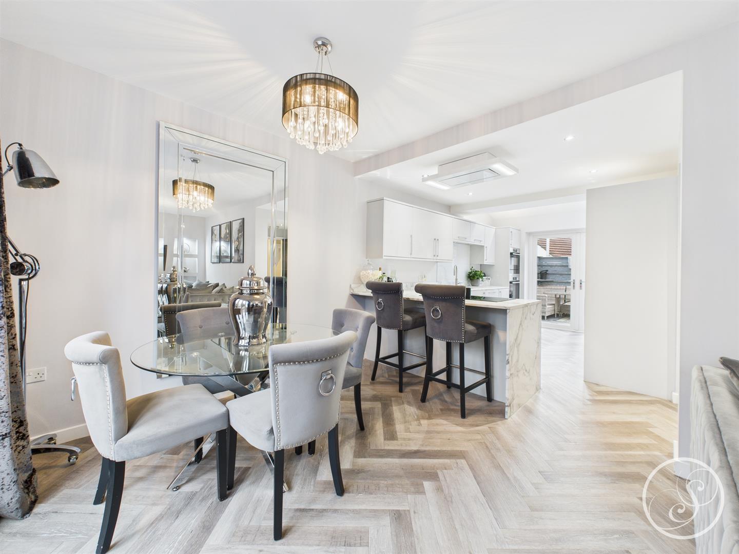 Kitchen/Living/Diner - Open plan kitchen featuring LVT wood flooring and an attractive L-shaped worktop with breakfast bar seating, complete with integrated storage cupboards, and high end integrated appliances including oven, microwave, hob, and dishwasher. There is ample space for a large double fridge. The kitchen is seamlessly open to the dining space and living room creating an ideal space for family gatherings. French doors to both the front and rear elevation of the property open out to the front garden and rear patio, creating a bright and seamless indoor-outdoor feel.