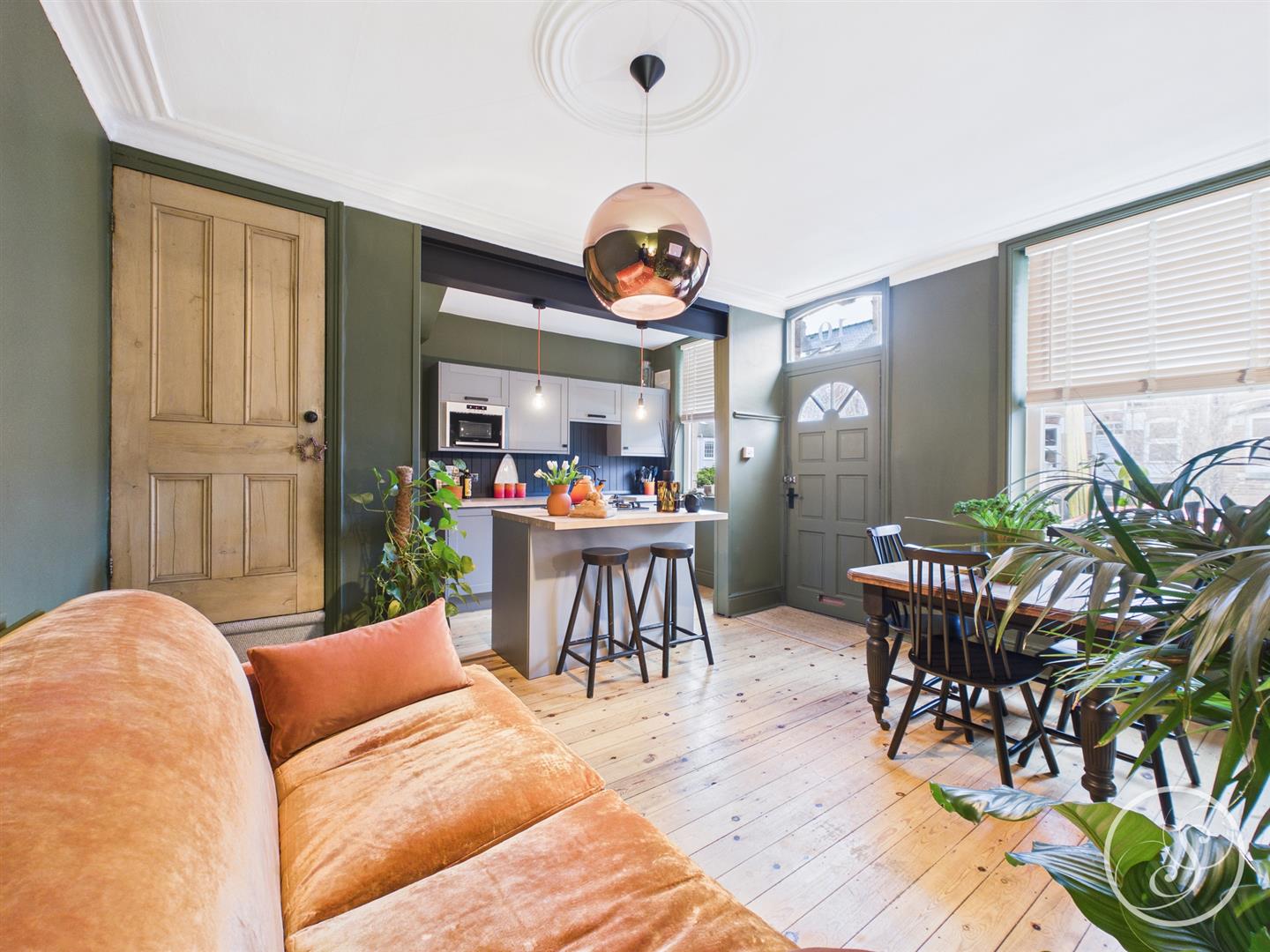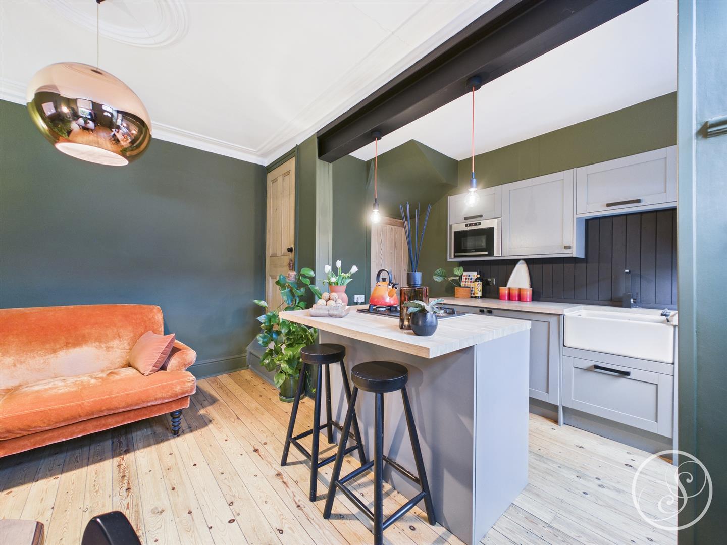 Kitchen/Living/Diner - Situated to the ground floor is this superb open plan kitchen/living/diner. The kitchen has recently been updated by the current owner and boasts an array of integrated appliances including oven, gas hob, dishwasher, under counter fridge and separate freezer, Belfast sink and plenty of storage space. The kitchen features a wonderful central island with breakfast bar seating. The room offers ample space for a formal dining table as well as space for seating. Original wood flooring and feature fireplace as well coving and ceiling rose give a wonderful touch of character to the modern living space.