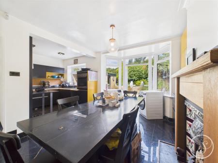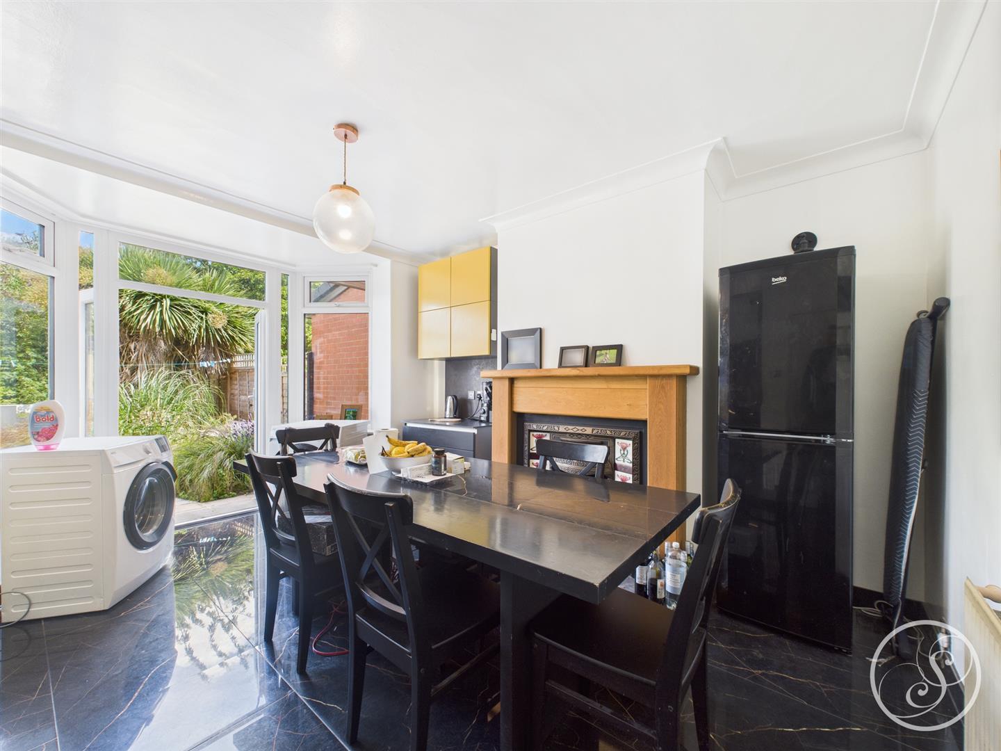 Dining Room - This spacious room features tiled flooring, integrated storage, a fireplace, and a large window with double doors leading to the garden. It boasts tall ceilings, a door to the hallway, and is open-plan, shared with the kitchen.