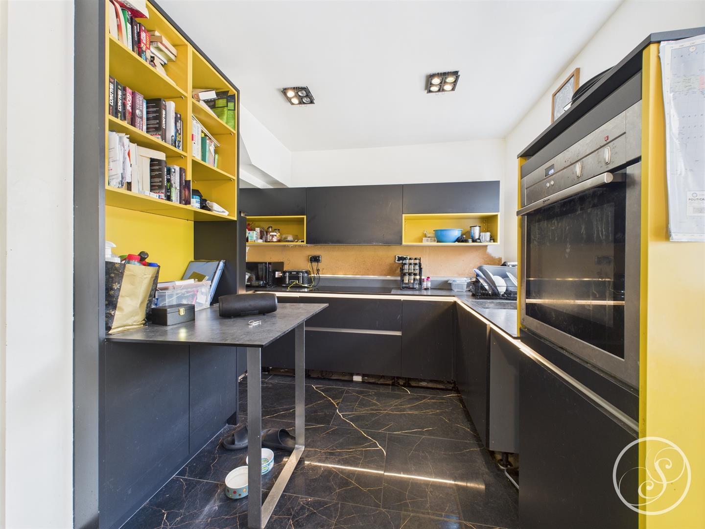 Kitchen - Tiled flooring with integrated storage and appliances, tall ceilings, and a large window providing ample natural light. Shared open-plan space with the dining room.