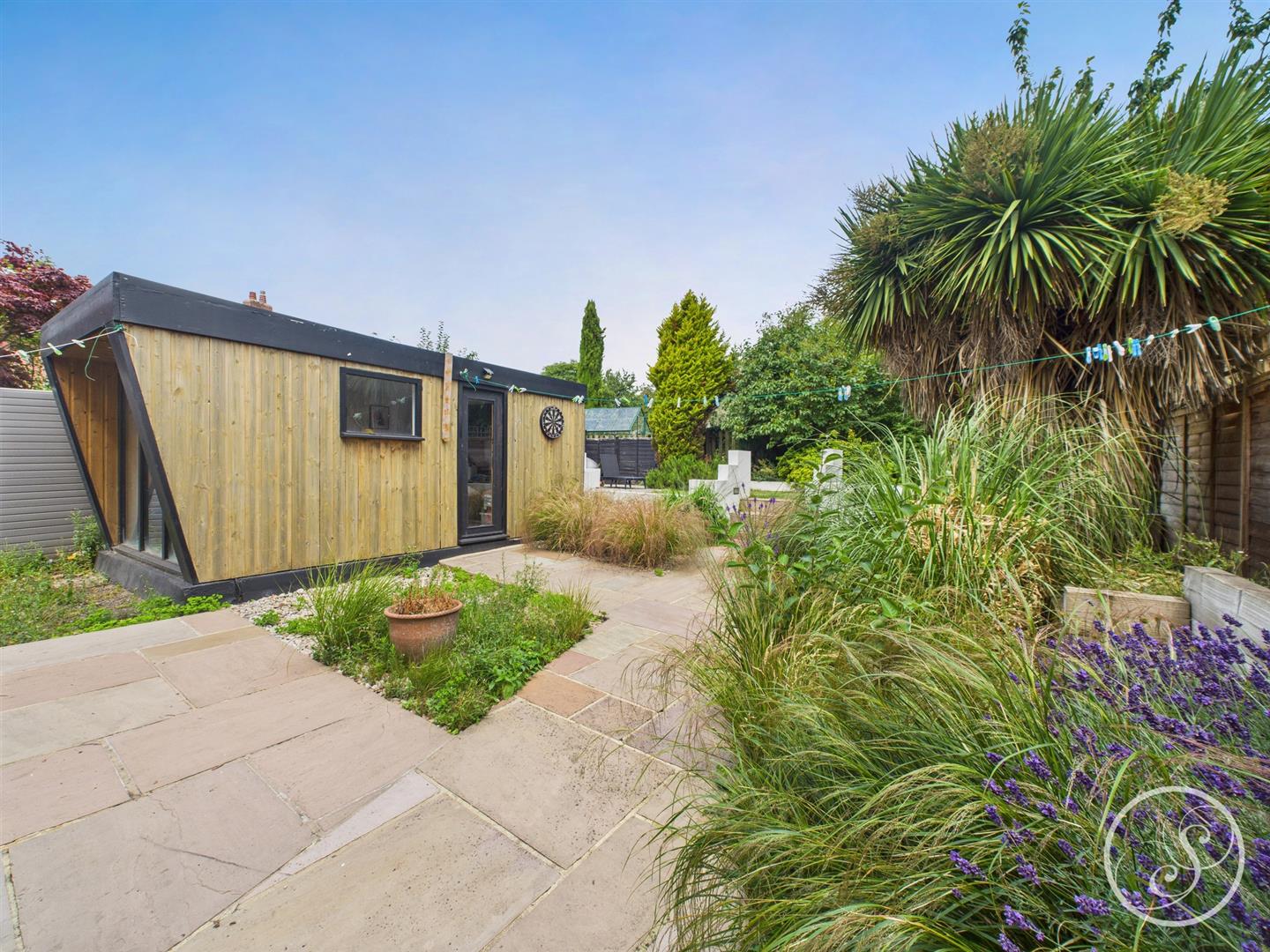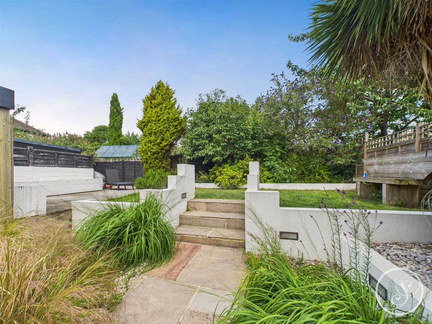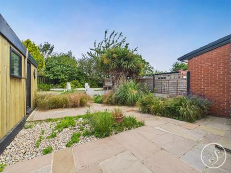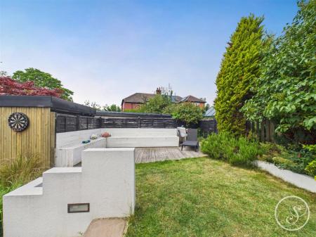 The well-maintained back garden offers paved patio areas, mature shrubs, and ornamental grasses, creating a peaceful outdoor space. Steps lead up to a raised lawn area bordered by low white walls. The entire garden is fully fenced, giving it a private feel, and there is also an outhouse which is fully insulated and has electrics. The Outhouse provides versatile use, perfect for relaxation or work. The garden is fully enclosed, providing privacy and a tranquil setting.