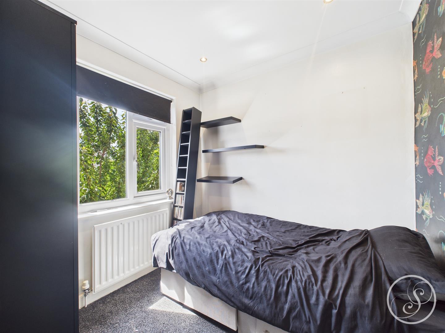 Bedroom 3 - Laid to carpet, with a central heating radiator, tall ceilings, and a large window.
