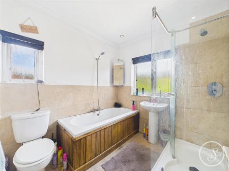 Upstairs, there are three good-sized bedrooms, providing flexibility for family, guests, or a home office. The bathroom offers a functional layout with essential fixtures.