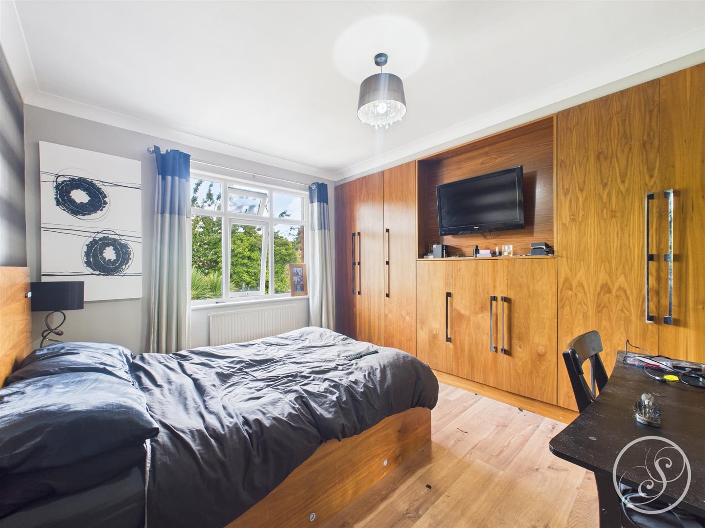 Bedroom 2 - Laminate flooring, integrated storage and cupboards, a central heating radiator, a large window, and tall ceilings.