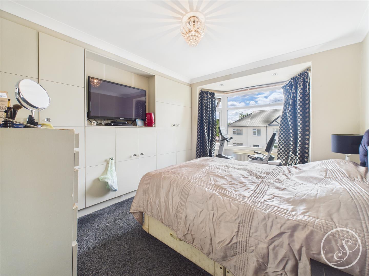 Bedroom 1 - Laid to carpet, featuring integrated storage and cupboards, tall ceilings, large arched windows, and a central heating radiator.