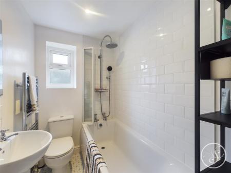 Bathroom - Comprising shower over bath, toilet and sink.