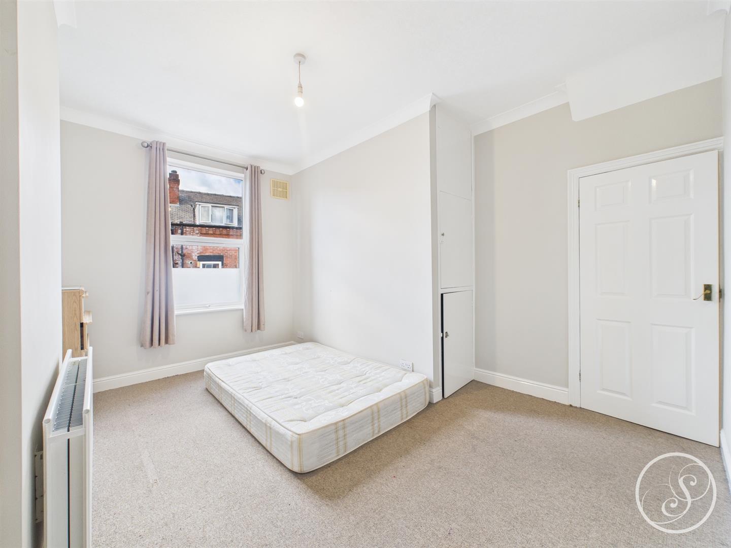 Bedroom 2 - The room is laid to carpet and benefits from tall ceilings, a large window providing ample natural light, and a central heating radiator, creating a bright and comfortable space.