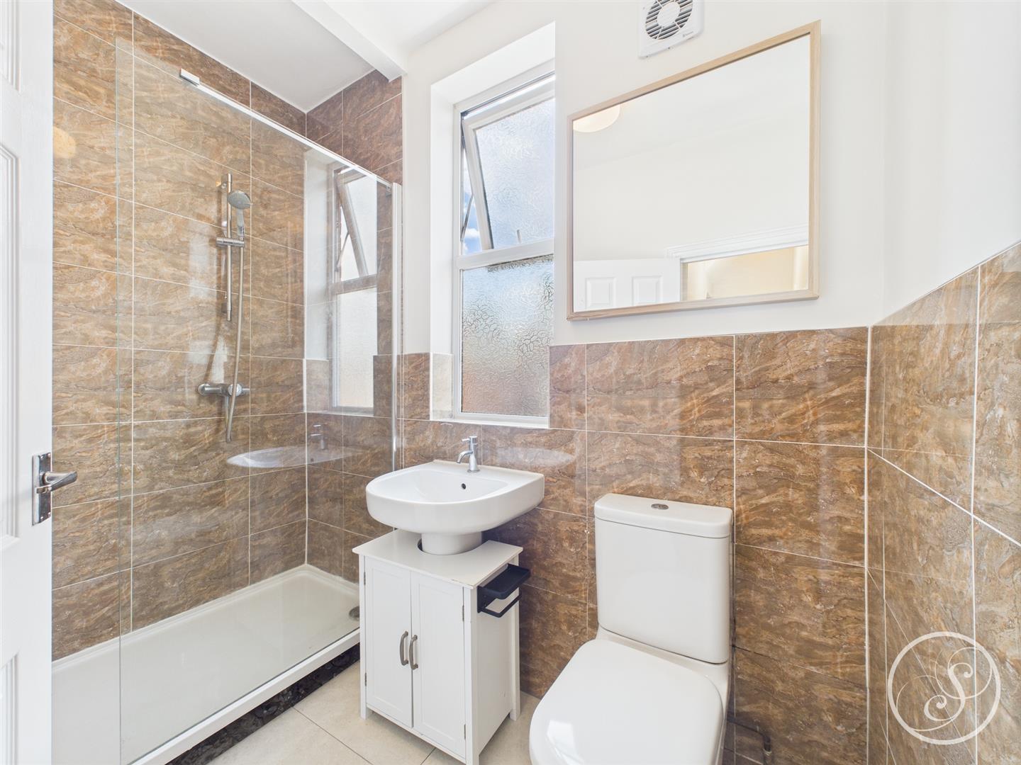 Bathroom - The bathroom is 3/4 tiled and fitted with a large free-standing shower, a central heating towel radiator, wash basin, and a toilet, combining practicality with a modern finish.