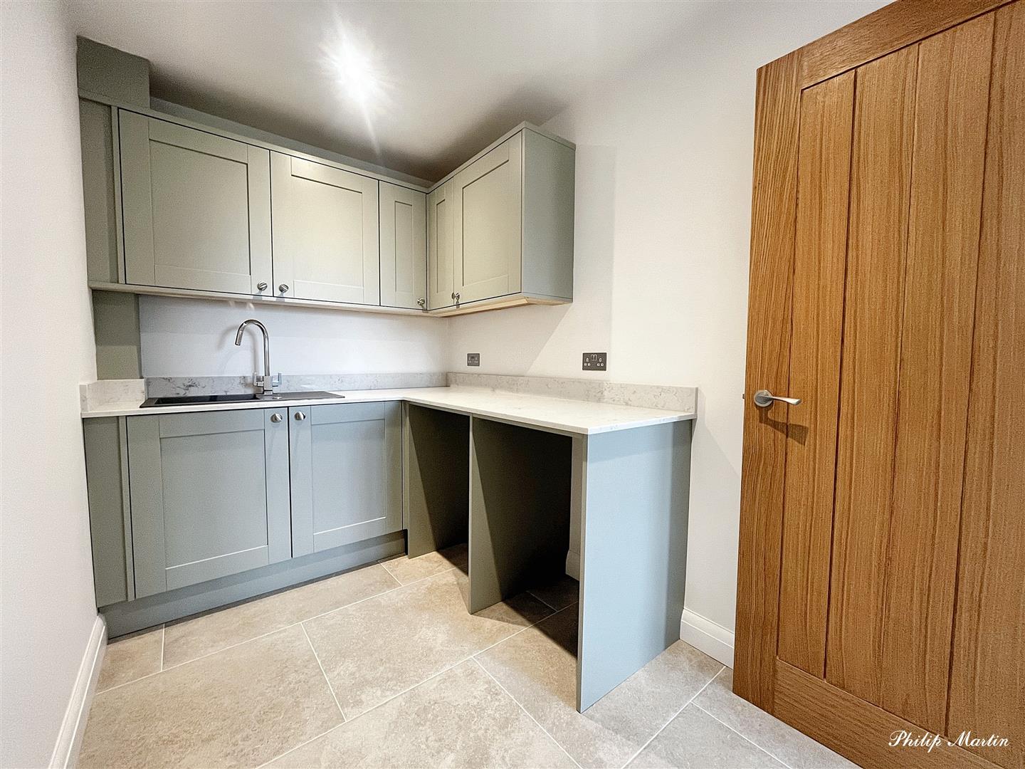 Utility Room - Base and eye level shaker style kitchen units with quartz worktops and incorporating single sink. Space and plumbing for washing machine and space for tumble dryer. Tiled floor with underfloor heating. Door to: