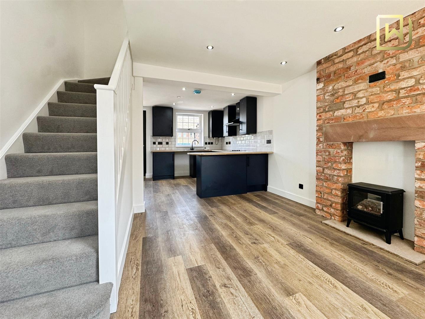 Living Area - 3.21 x 3.80 (10'6" x 12'5" ) - Wooden design flooring. Wall mounted radiator. UPVC double glazed window to the front aspect. Brick fireplace. Electric log burner fire. Open Plan access into kitchen. Stairs leading to 1st floor accommodation. Inset spotlights.