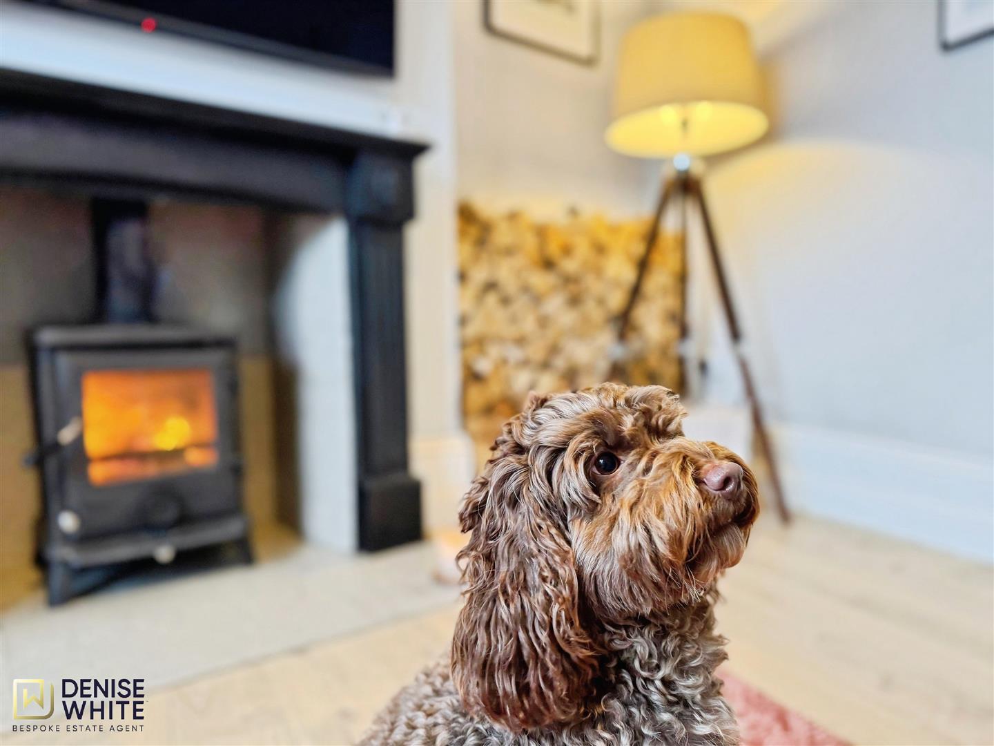 Upon entering, you are greeted by a spacious and elegant entrance hall, showcasing a striking tiled floor, bespoke panelling, and detailed coving - setting the tone for the quality found throughout. The living room exudes warmth and character, with a double-glazed bay window and a multi-fuel burner creating a cosy and inviting ambiance.