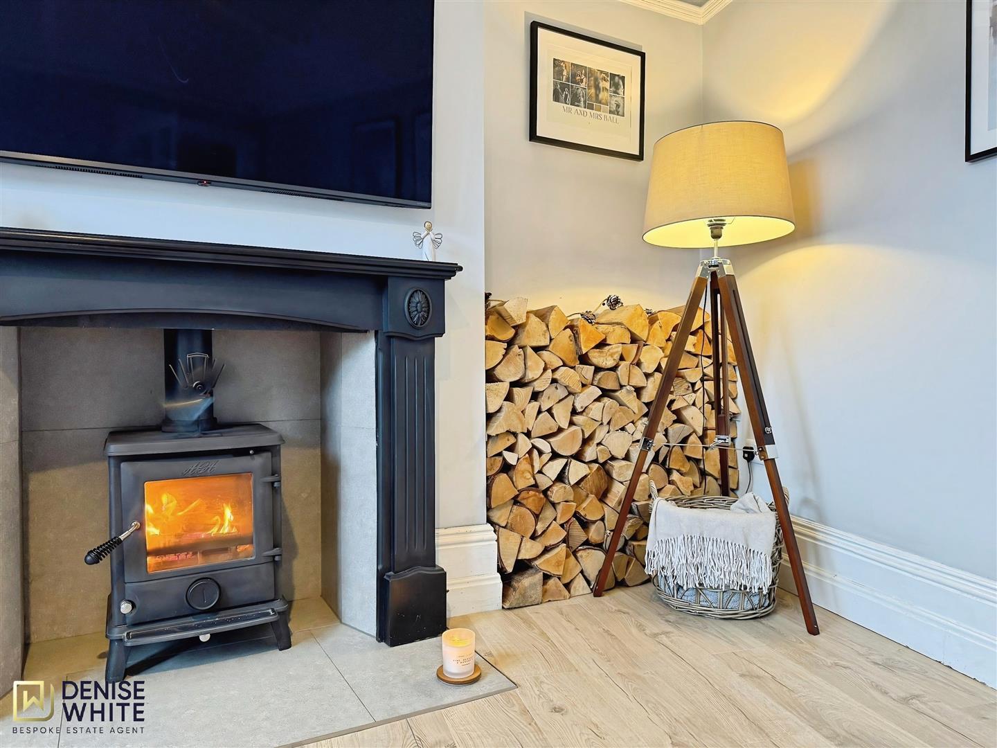 Living Room - 4.54 x 4.26 (14'10" x 13'11" ) - Continued wood effect flooring. Wall mounted radiator. Multi fuel burner. Wooden double glazed sash bay window to the front aspect. Picture railing. Coving. Ceiling light.