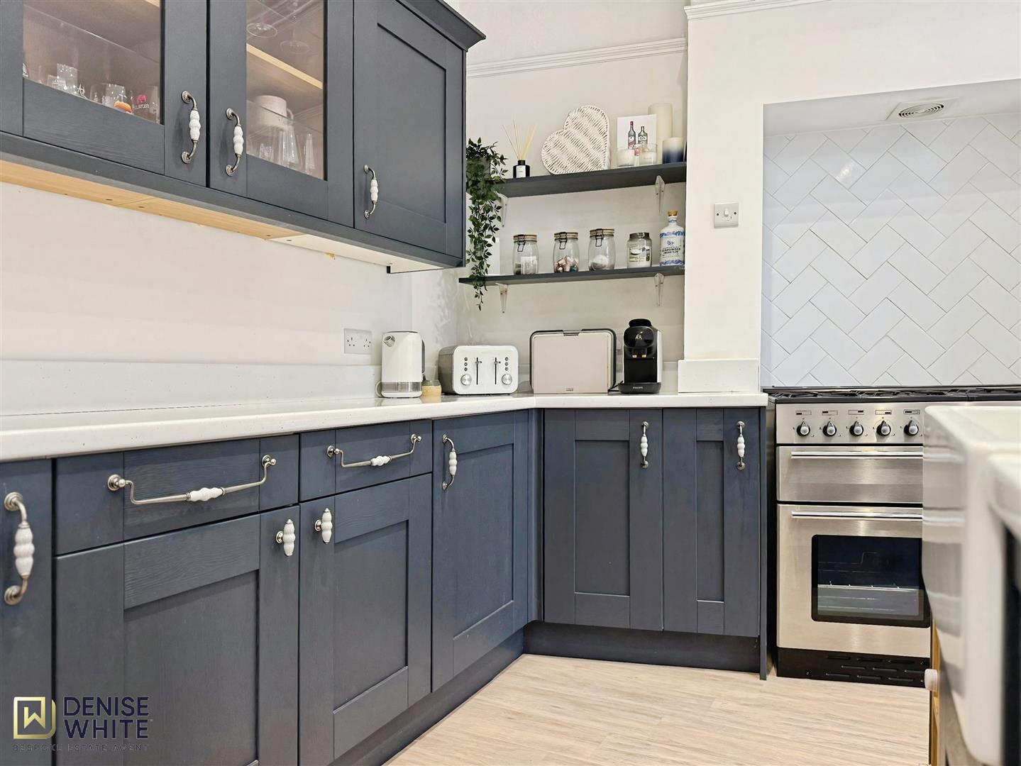 Breakfast Kitchen - 4.61 x 4.11 (15'1" x 13'5") - Continued wood effect flooring. A range of wall and base units with laminate work surfaces above. Integrated dish washer, Belfast sink with mixer tap above. Space for range style cooker and American style fridge freezer. Wall mounted radiator. French doors to the rear aspect. Picture railing. Inset spotlights. Ceiling rose. Ceiling light.