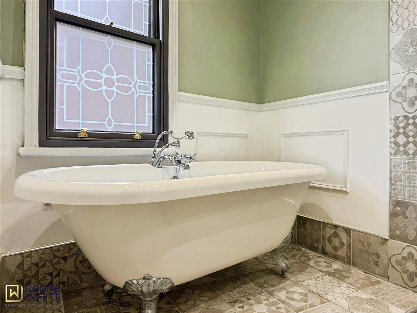 Bathroom - 4.13 x 1.86 (13'6" x 6'1") - Tiled flooring. Low level WC. Vanity unit incorporating wash hand basin. Bespoke panelling. Free standing roll top bath with shower attachment. Wall mounted column radiator. Walk in shower with rain style shower head. Inset spotlights. Extractor fan.