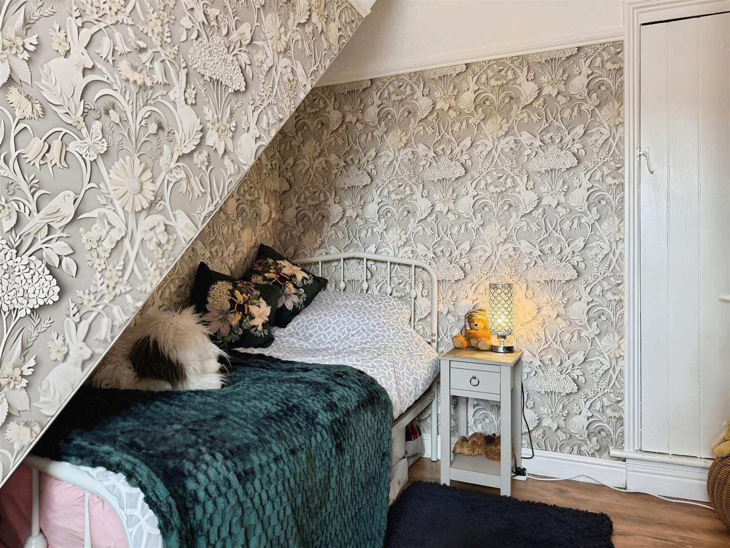Upstairs are two bedrooms, along with a converted loft room featuring a Velux window-ideal for occasional use as a study, hobby space or additional storage. To the rear, a peaceful sun house overlooks a well-maintained, colourful garden, enhanced by an array of mature potted plants.
