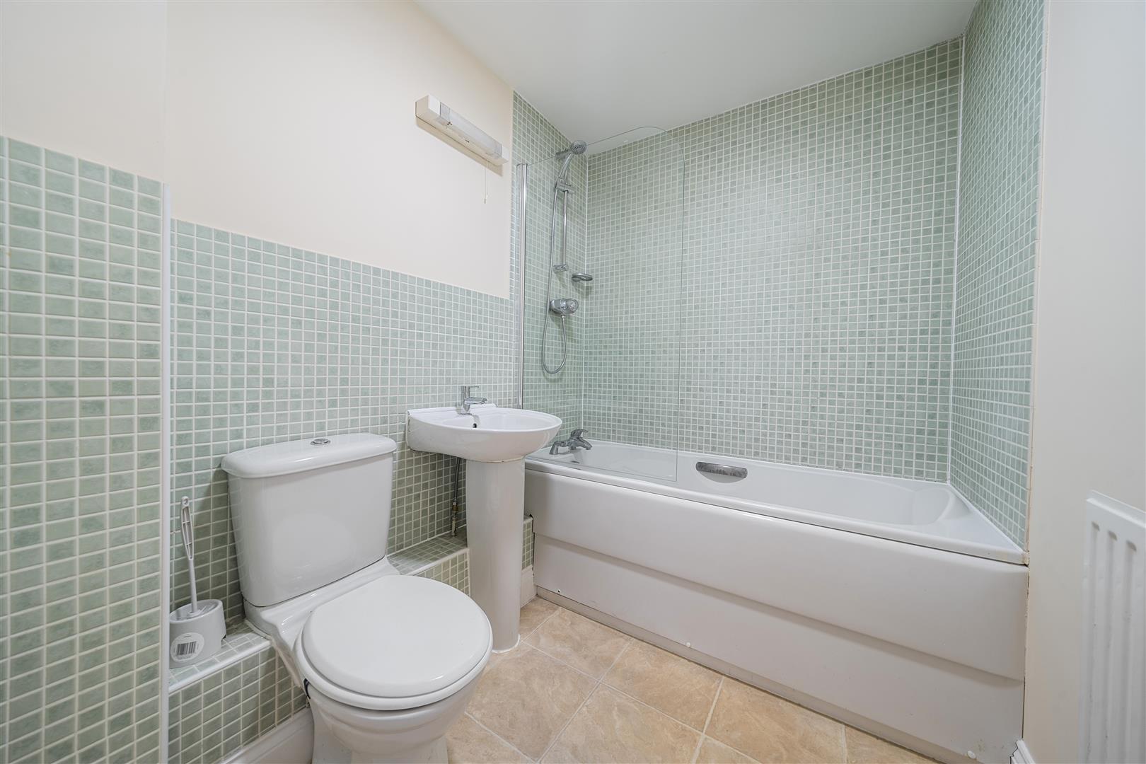 Comprising of panel bath with shower above, splashback tiling, pedestal wash hand basin, WC and radiator.