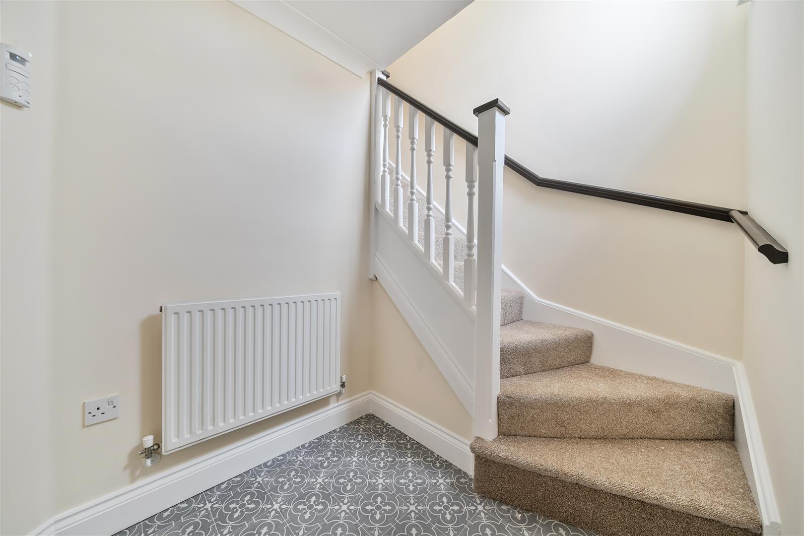 Comprising a range of wall and base units, roll top work surfaces, built in twin oven and gas hob. There is space and associated plumbing for a washing machine, an inset stainless steel sink unit with mixer tap above, space for an upright fridge/freezer and splashback tiling. There is a double glazed window that looks out to the rear, fitted extractor fan, built in cupboard housing replacement combination hot water boiler plus storage space.