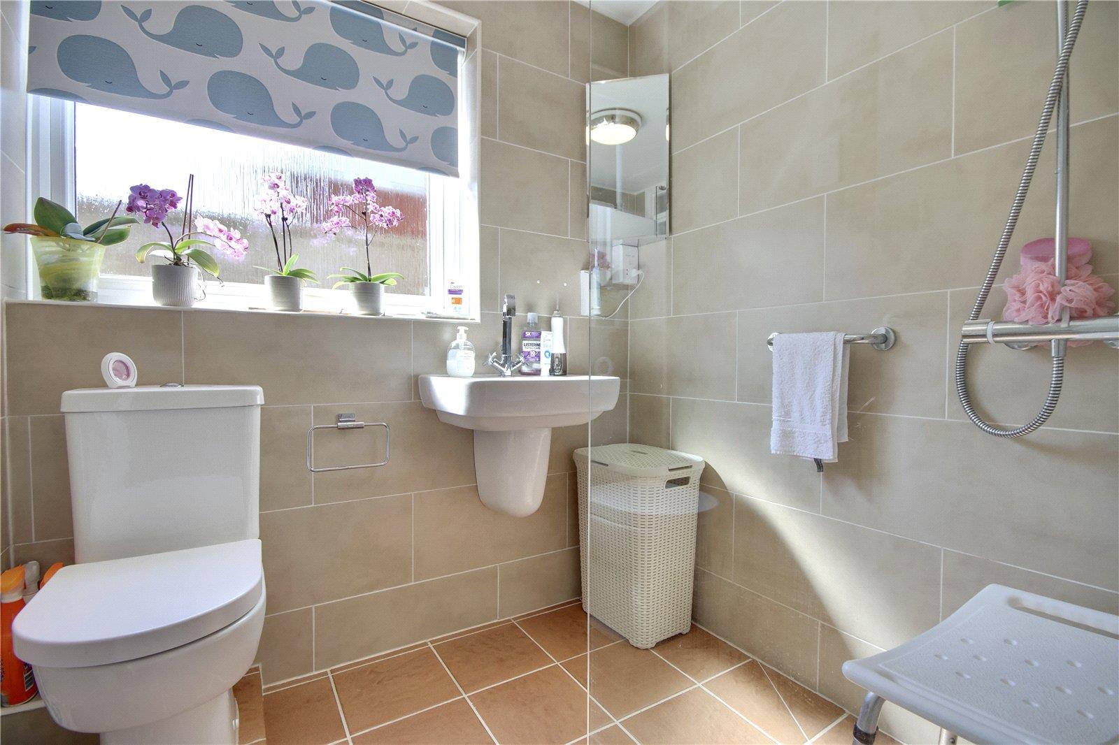 Refitted with a modern walk in shower, glass screen and twin shower heads, WC, wash hand basin, tiled walls and floor, chrome ladder style radiator, electric shaver point and double glazed window.