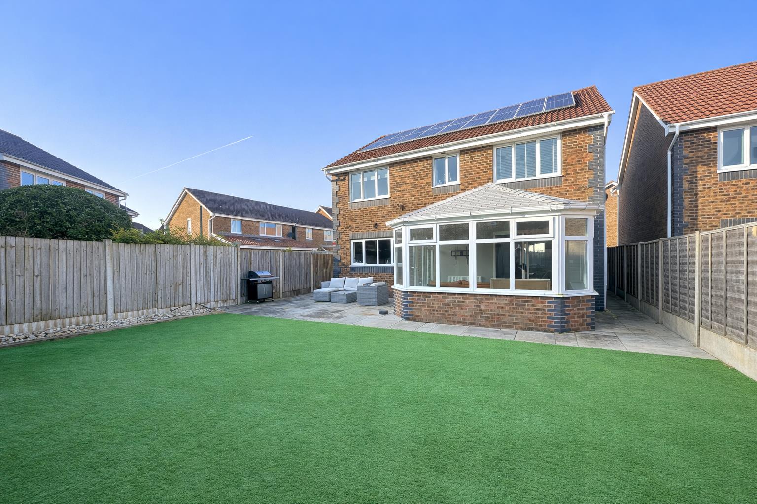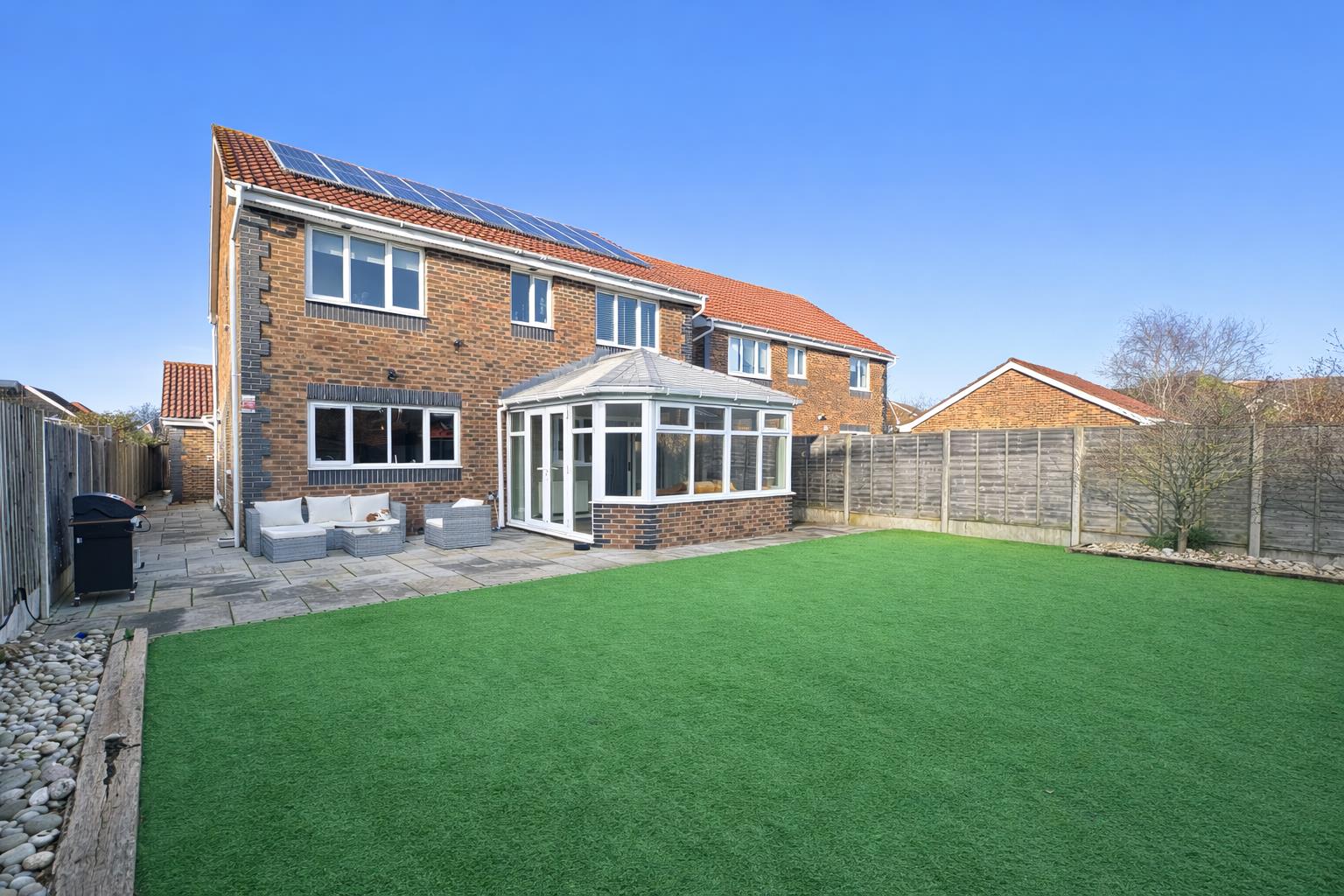 Externally, the rear garden is a generous size and laid predominantly to artificial lawn for low-maintenance enjoyment year-round.