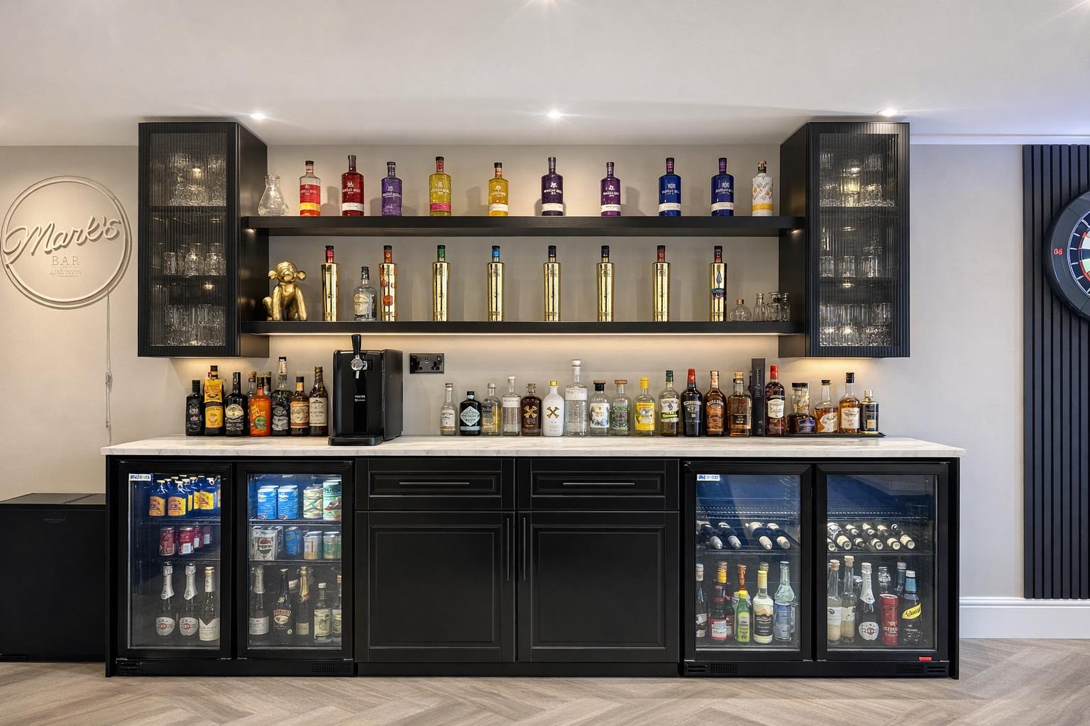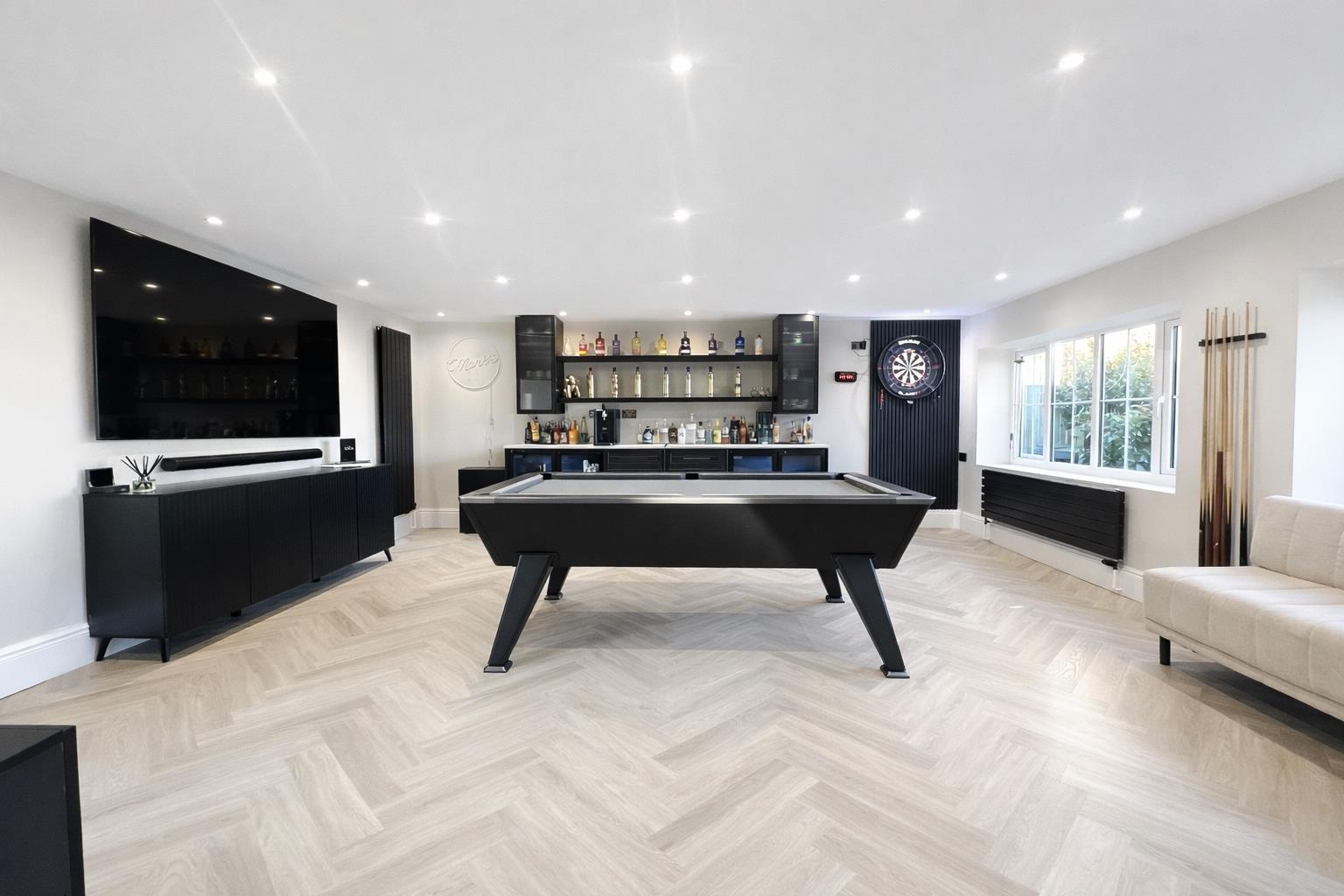 One of the standout features is the incredible double garage conversion, now transformed into a vast games and entertainment room. Designed as the ultimate social hub, it comfortably accommodates a pool table, darts board, bar area, sofas, music space and a large TV, the perfect setting for family time or entertaining friends.