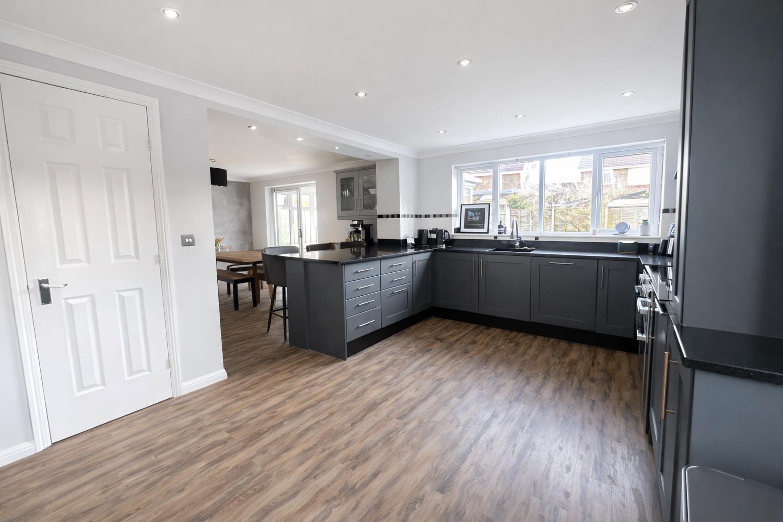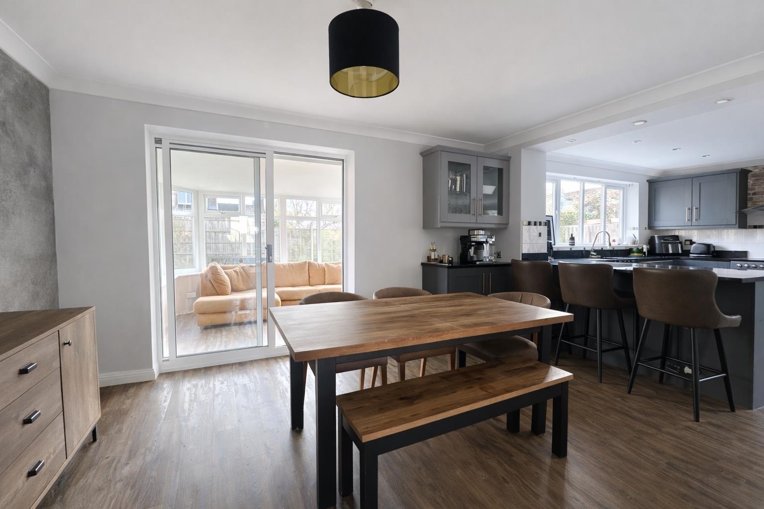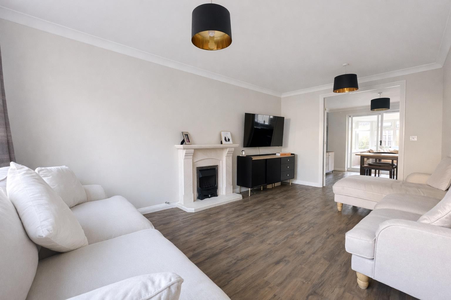 The ground floor offers generous and well-balanced living space. A welcoming sitting room sits at the front of the property, complete with feature fireplace and double doors leading through to the dining area. Spanning the rear of the home is an impressive open-plan kitchen/diner with a substantial breakfast bar, integrated appliances, extensive worktop space and ample storage. A separate utility room adds practicality, while a garden room accessed from the dining area provides additional flexible living space overlooking the garden.