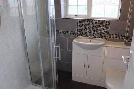 Shower Room - 6'3 x 6'2 (1.91m x 1.88m) - UPVC double glazed opaque window, heated chrome towel rail, fitted with white suite comprising of shower cubicle with electric shower, vanity wash hand basin, wc, mainly tiled walls.