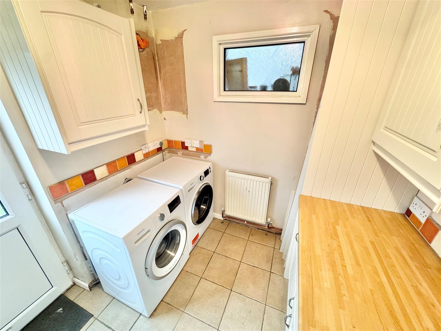 The kitchen diner is a highlight of the home, boasting dual aspect windows that create a bright and airy space. The kitchen area is equipped with a range of wall and base units, a sink and drainer unit set into a rolled-edge work surface, and integrated appliances including an oven, hob, and extractor hood. There is also space for a dishwasher. An archway leads to the utility area, which houses the tumble dryer and has plumbing for a washing machine, with a door providing access to the garden. The dining area has space for a family-sized table, making it perfect for gatherings.