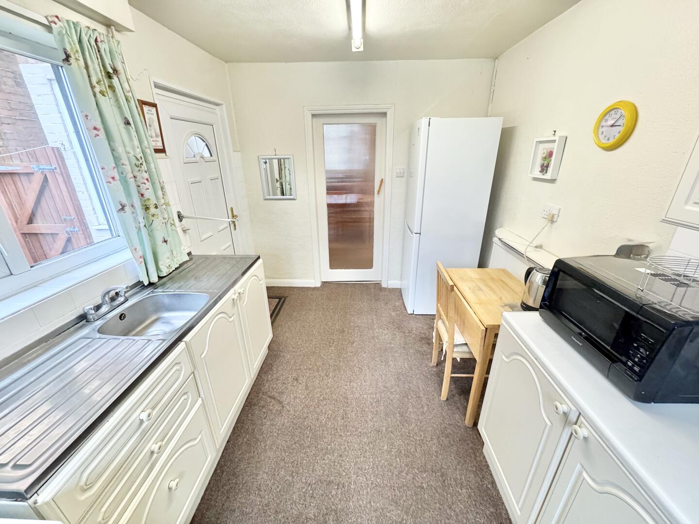 Upon entering, you are welcomed into a spacious lounge diner, a versatile and inviting space ideal for both relaxing evenings and entertaining guests. The kitchen is fitted with white base units, a stainless steel sink and drainer, and offers space for appliances. A courtesy door provides direct access to the rear garden, adding practicality to the layout.