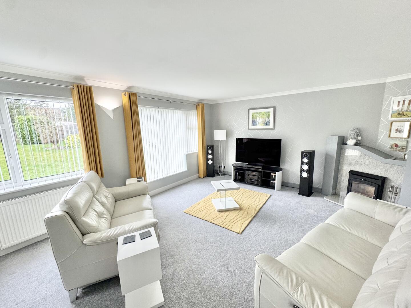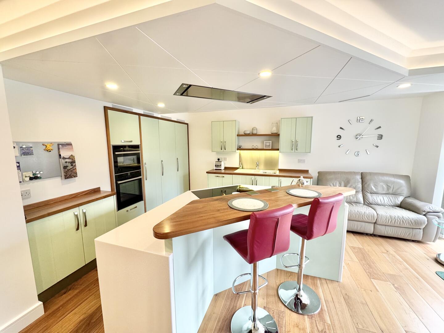 The heart of this home is undoubtedly the fitted open-plan kitchen, which seamlessly combines a dining area and a sitting area, making it perfect for both entertaining and family gatherings. Underfloor heating runs throughout the hallway, into the dining kitchen. The kitchen features a breakfast bar, ideal for casual meals or morning coffee. Adjacent to this, the living room offers a spacious and cosy atmosphere, enhanced by beautiful views of the garden, creating a serene retreat for relaxation.