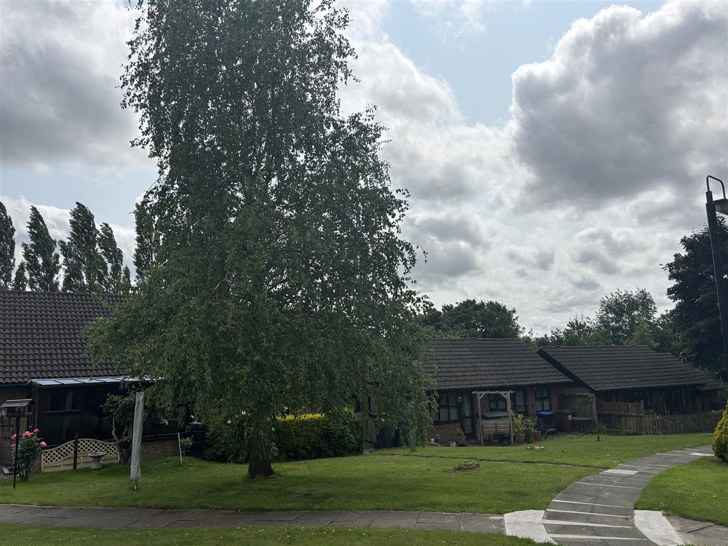 Outside - The front of the property is a communal open plan garden laid mostly to lawn with a mature tree