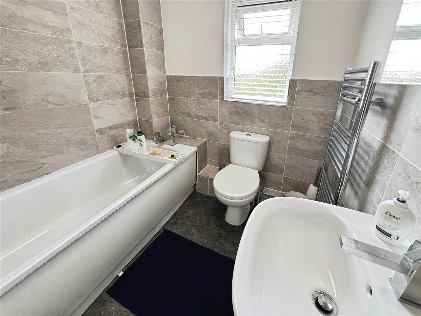 Upstairs, the property continues to impress with a stylish modern bathroom featuring a white three-piece suite and contemporary grey tiling. There are two good-sized bedrooms, with the main bedroom benefiting from fitted wardrobes offering excellent storage.