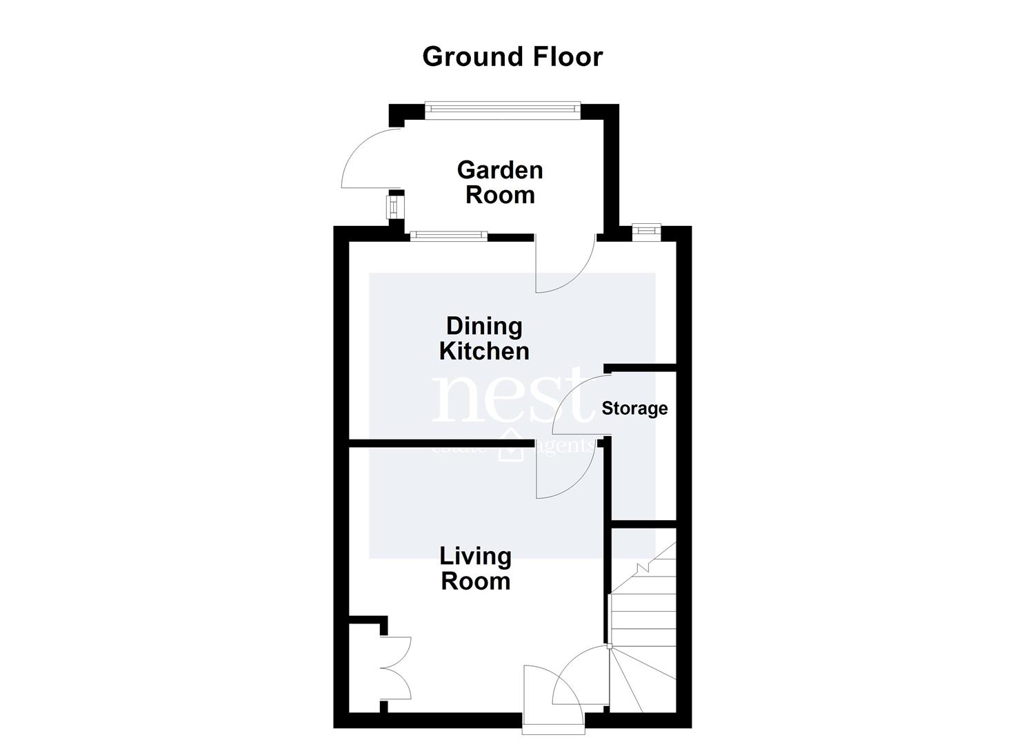 The property welcomes you into a living room with stairs rising to the first floor. To the rear is a dining kitchen featuring base units, a work surface with sink drainer, and space for appliances. There is room for a dining table and chairs, a storage cupboard, and a door leading to a brick and timber garden room, perfect as a sunroom or additional utility space.