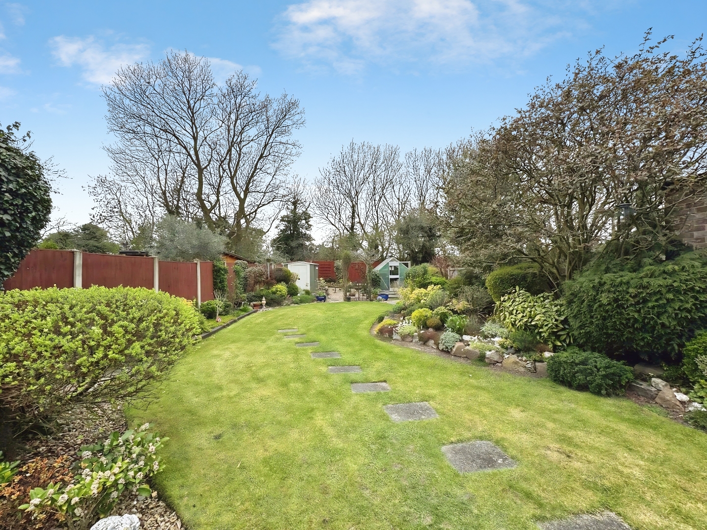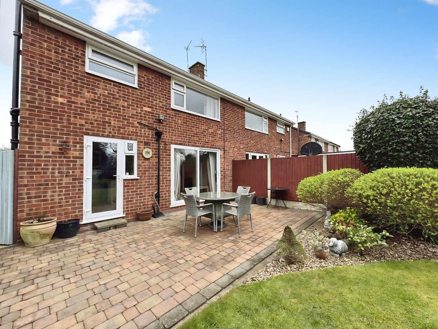 Externally, the property features an enclosed rear garden with a patio area and laid lawn, ideal for outdoor dining and family use.