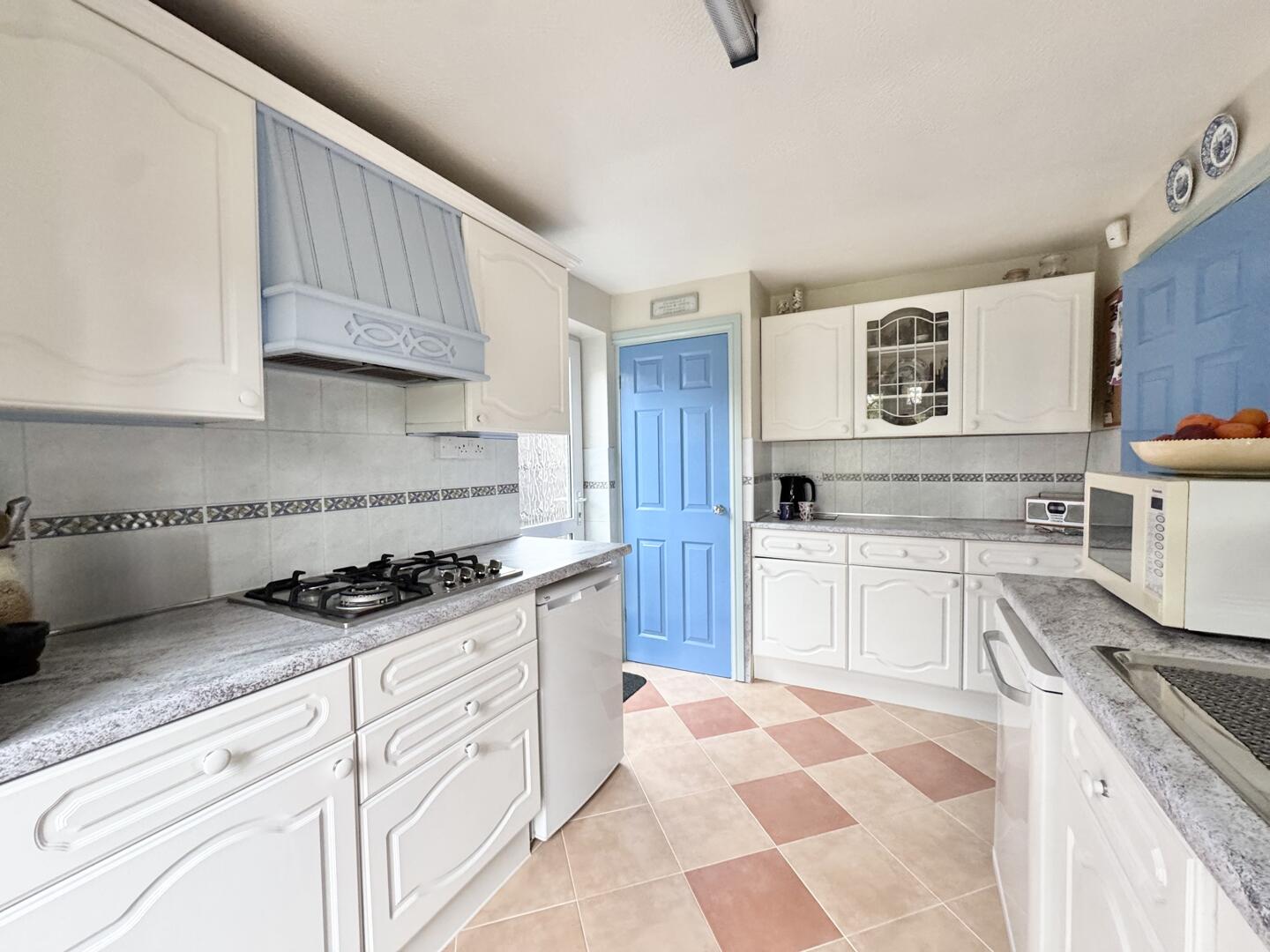 The fitted kitchen offers generous cupboard storage and includes an integrated oven, gas hobs, space for a fridge, and plumbing for a washing machine. There is also additional cupboard space that can be used as a pantry or extra storage.
