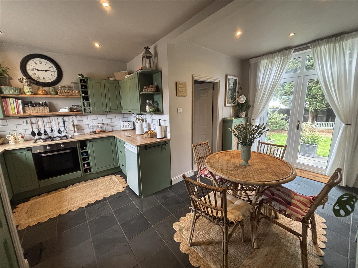 Kitchen-Diner - 5.00m x 4.10m max (16'4" x 13'5" max) - An L-shaped kitchen-diner with UPVC double glazed French doors to rear. UPVC double glazed window to front, tiled flooring, recessed spotlights. Fitted with a range of shaker style base, drawer & eye level units, work surfaces with white "London Tube" style tiled splashback, one and a half bowl stainless steel sink unit with mixer tap. Built-in electric fan assisted oven with gas hob. Pantry store, Combination boiler, spotlights to ceiling, radiator.