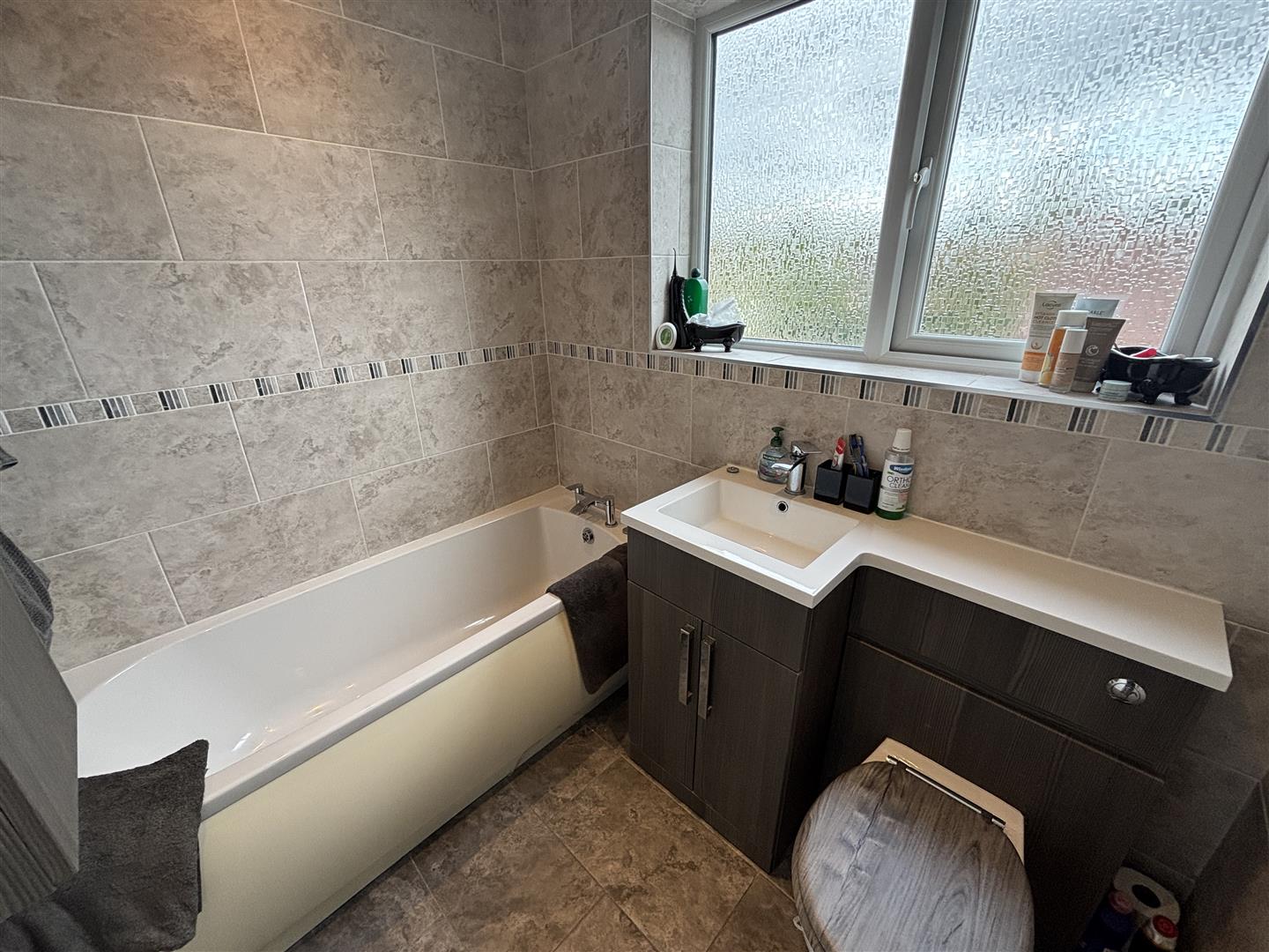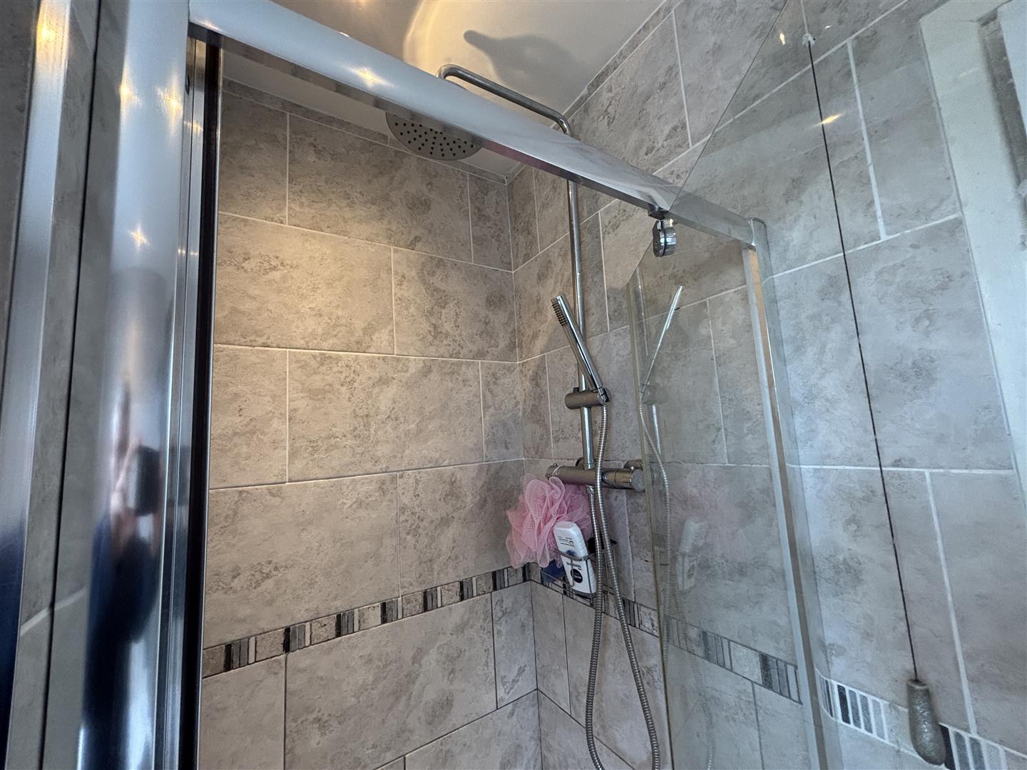 Bathroom - uPVC double glazed opaque window, fully tiled walls, panelled bath, separate shower cubicle, vanity wash hand basin, wc.
