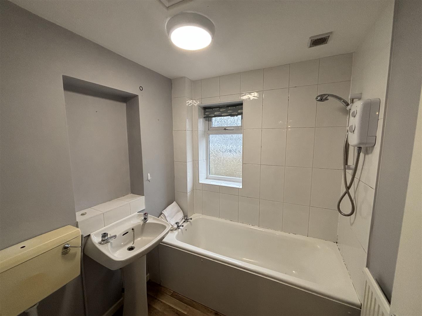 Bathroom - 1.94m x 1.85m (6'4" x 6'0") - UPVC double glazed opaque window, mainly tiled, panelled bath with electric shower over, pedestal wash hand basin, wc, access to loft.