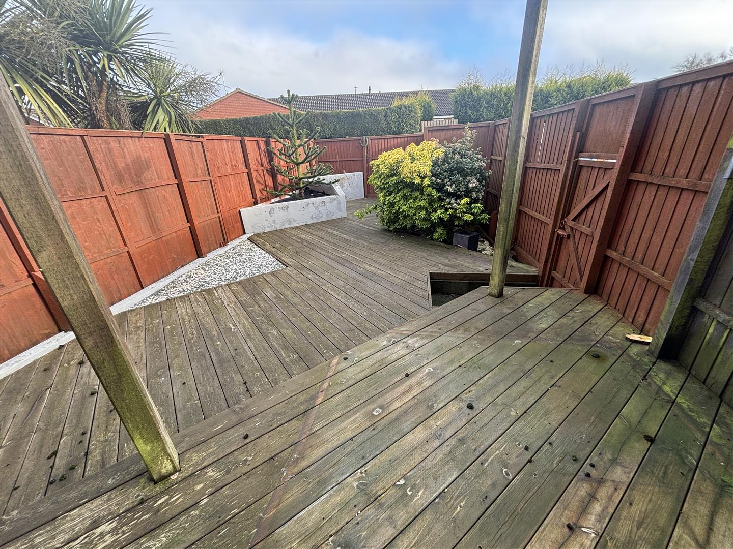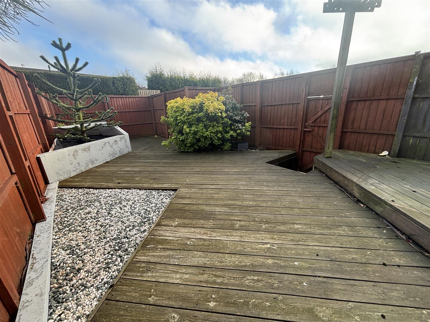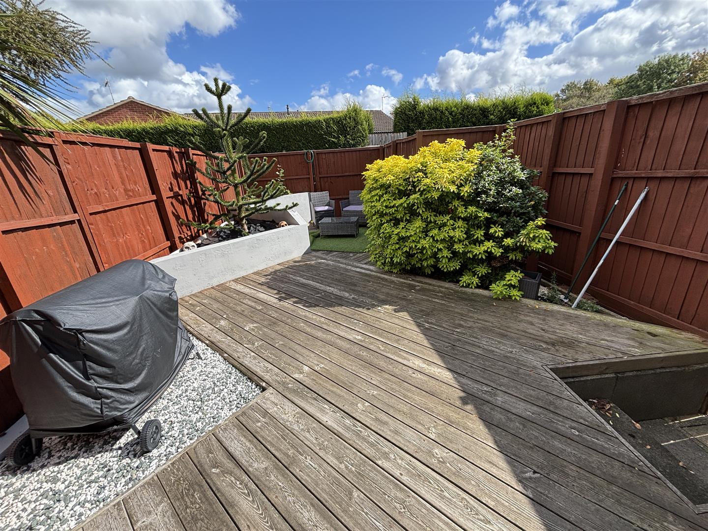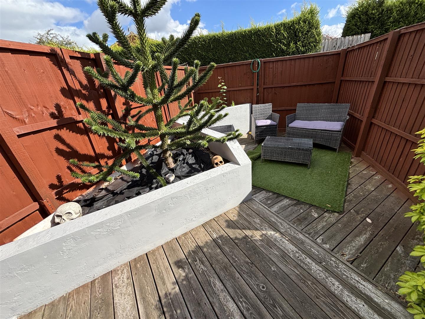 The private easy maintenance rear garden has decking, shrubs including large cactus, fully fenced boundaries & gate to side (garages).