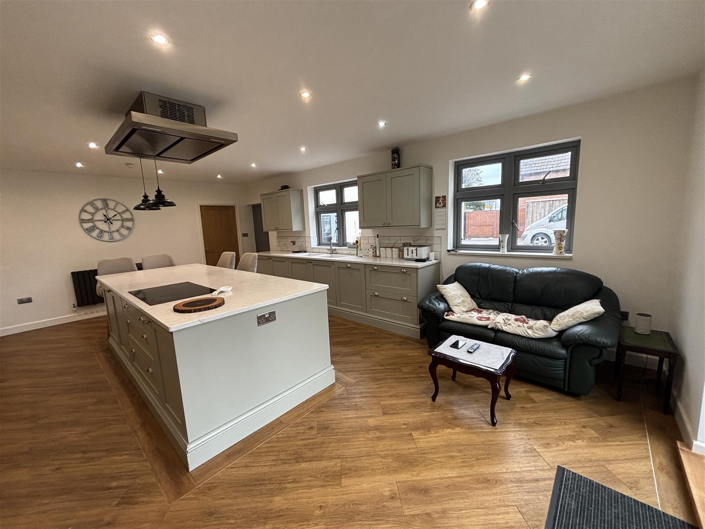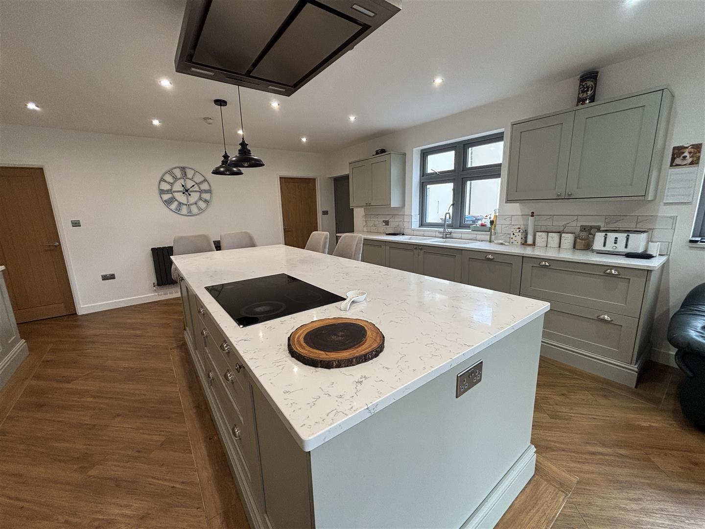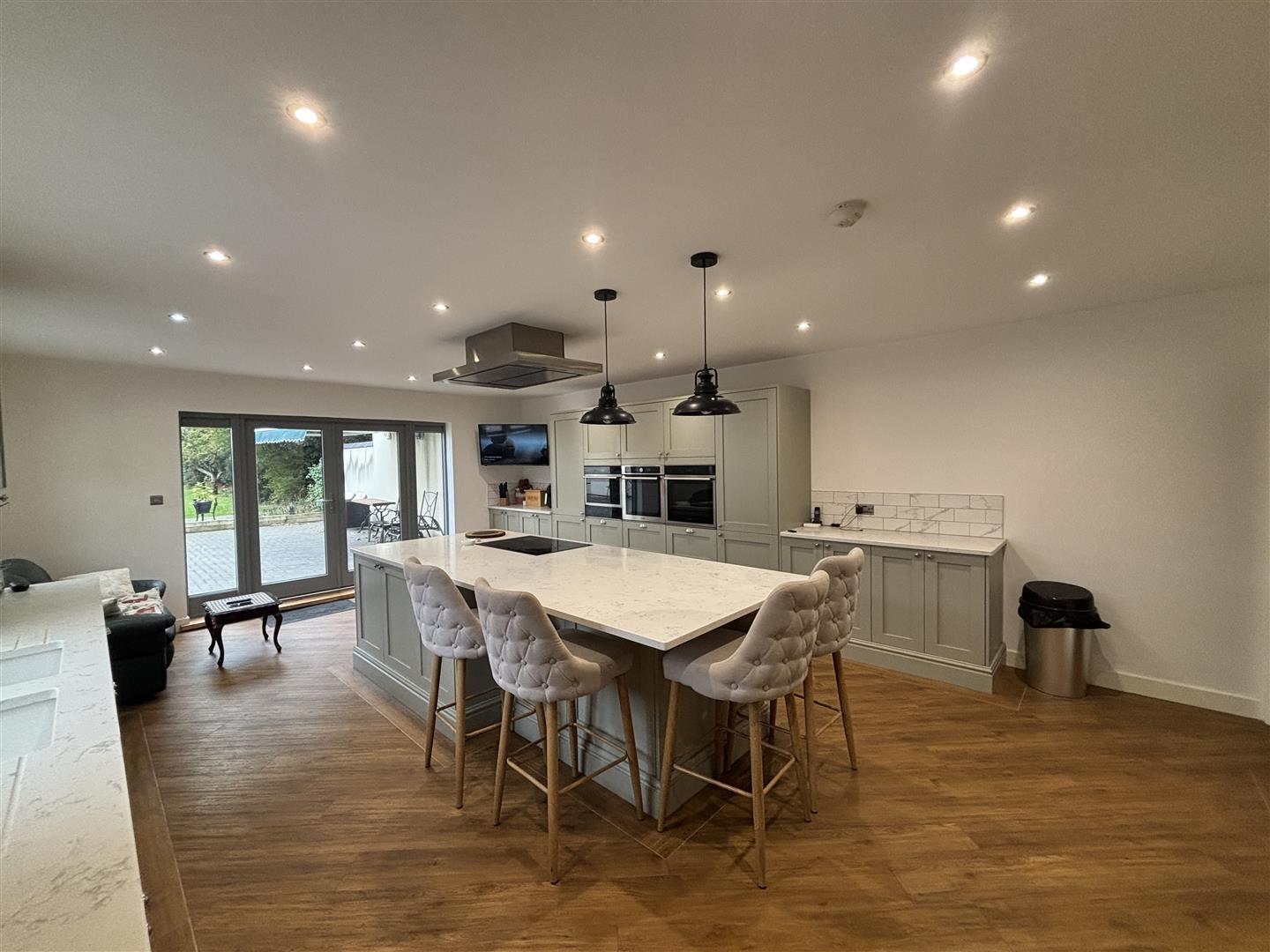 Living Kitchen - 7.13 x 5.12 (23'4" x 16'9") - French doors to rear, two double glazed windows to side, Amtico flooring, recessed spotlights, fitted with a range of base, drawer & eye level units, Quartz work surfaces, twin enamel sink unit with waste disposal, electric twin fan assisted ovens, induction hob with extractor hood. Integrated dishwasher, two fridges, two freezers, microwave.