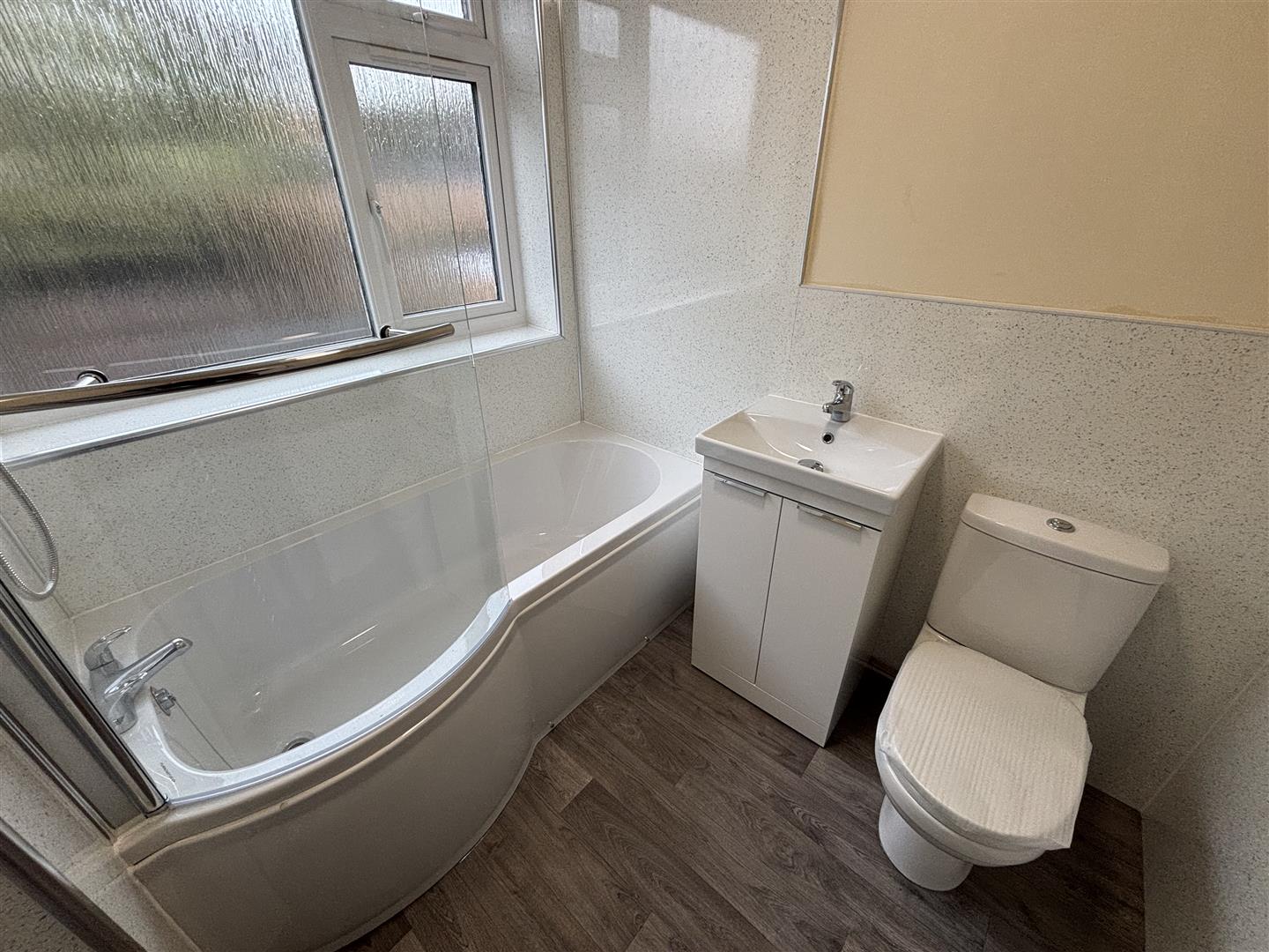 Bathroom - Brand new refitted modern bathroom. UPVC double glazed opaque window, chrome heated towel rail, shaped shower bath with mains shower, glass screen, wall boarding, vanity wash hand basin, wc.